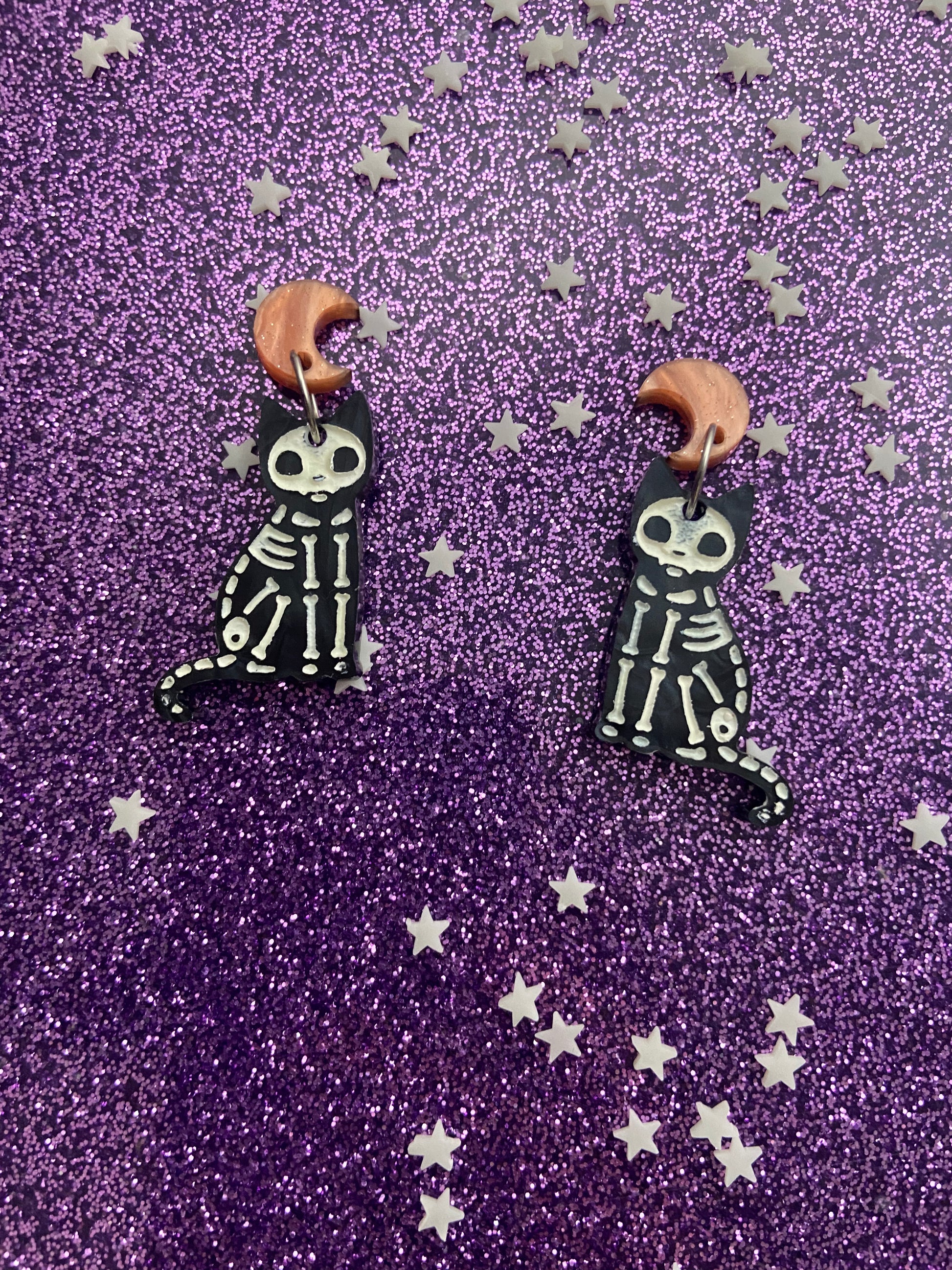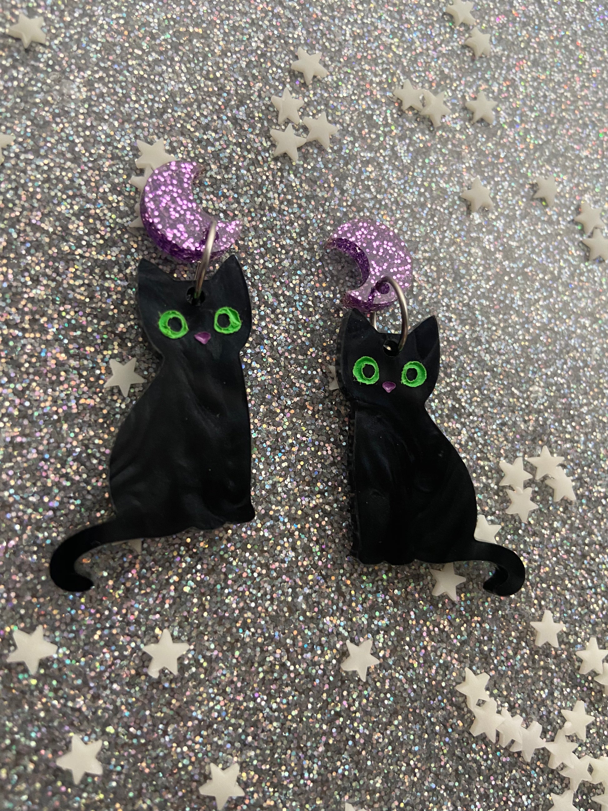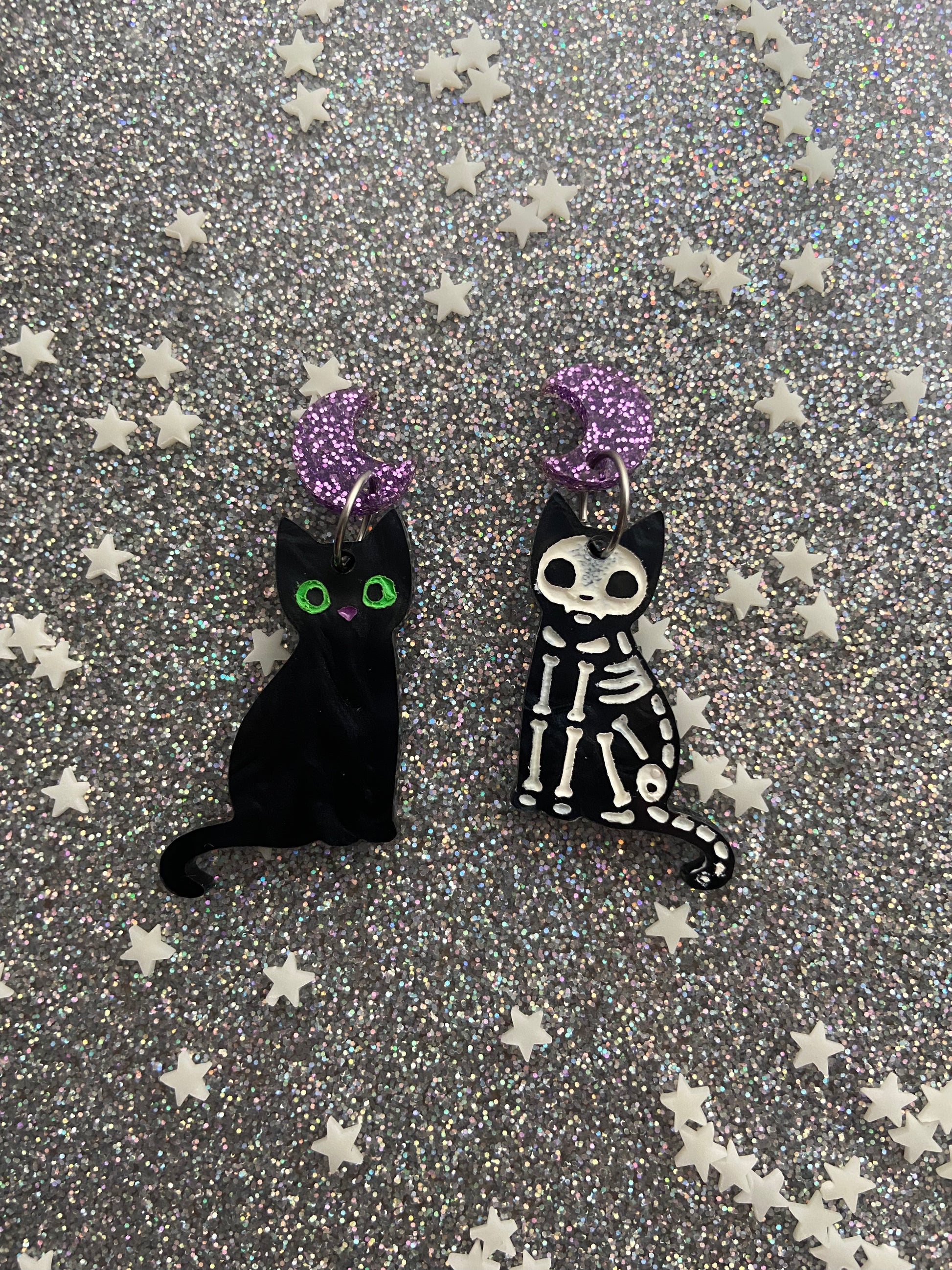 These dangle earrings can be either cute or spooky, the choice is yours! Choose from a pair of cute kitties, pair of skeleton kitties, or even get a mismatched pair to have it both ways! The skeleton kitty is also offered in two colors. The cats are made of black pearl acrylic, which has a subtle pearlescence to it. The cute kitties eyes and nose are engraved and hand painted in green and pink. The skeleton kitties are engraved as well and painted in either green or white. The green skeleton matches the cute kitty nicely, but I wanted to offer a traditional color as well. The closures pictured are acrylic moon stainless steel studs, stainless lever backs, and stainless steel ball studs. The moon studs come in 4 colors: black pearl (same material as the cats), pink pearl, glitter purple, glitter pumpkin spice. Since people prefer different closures, you have the option of selecting between studs, lever backs, and ear wires for your earring closure. If you select a closure other than a moon, your earrings will not have the moon included. The last picture shows an example of your choices. All earrings are hand assembled and designed by me.