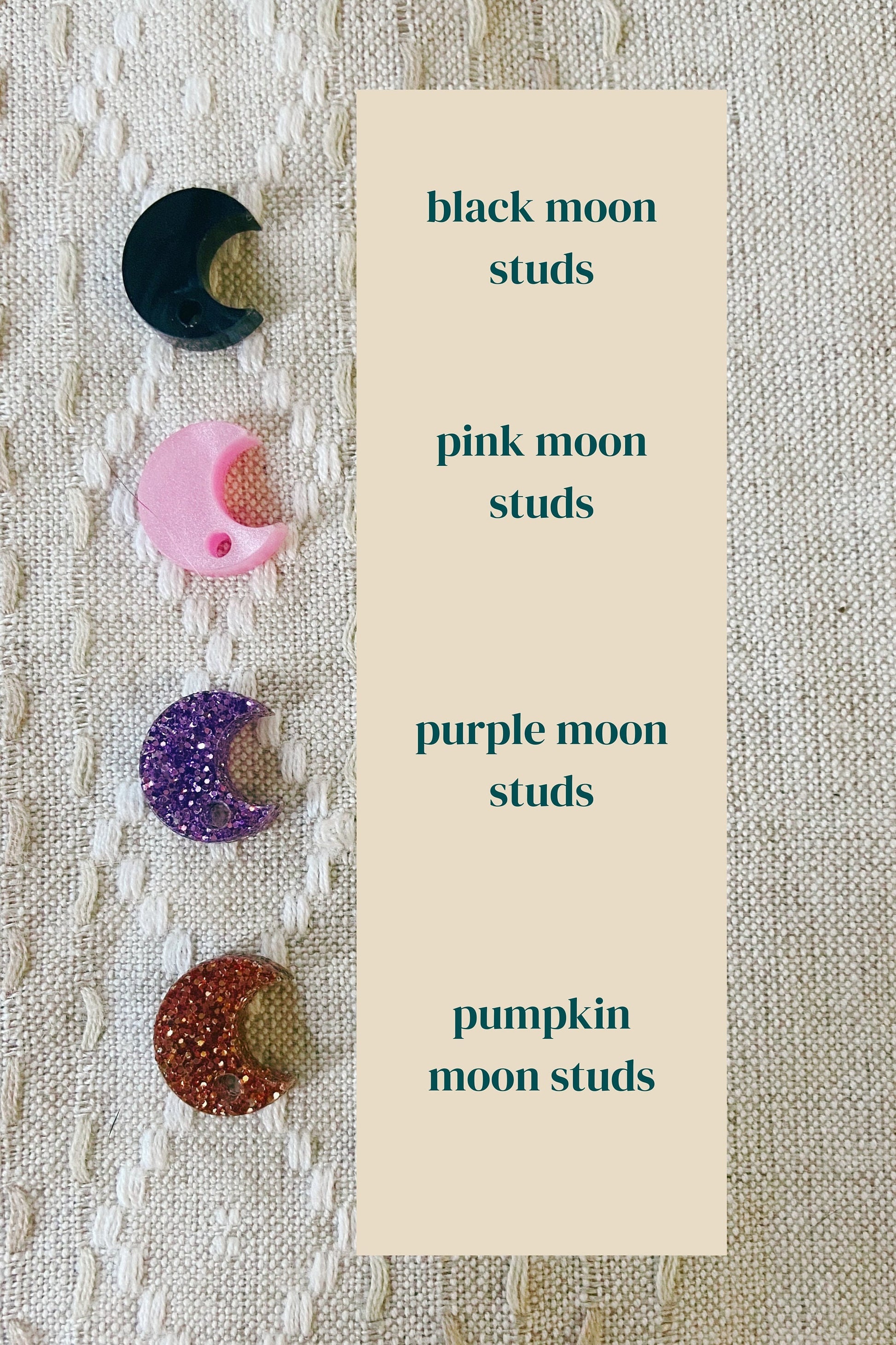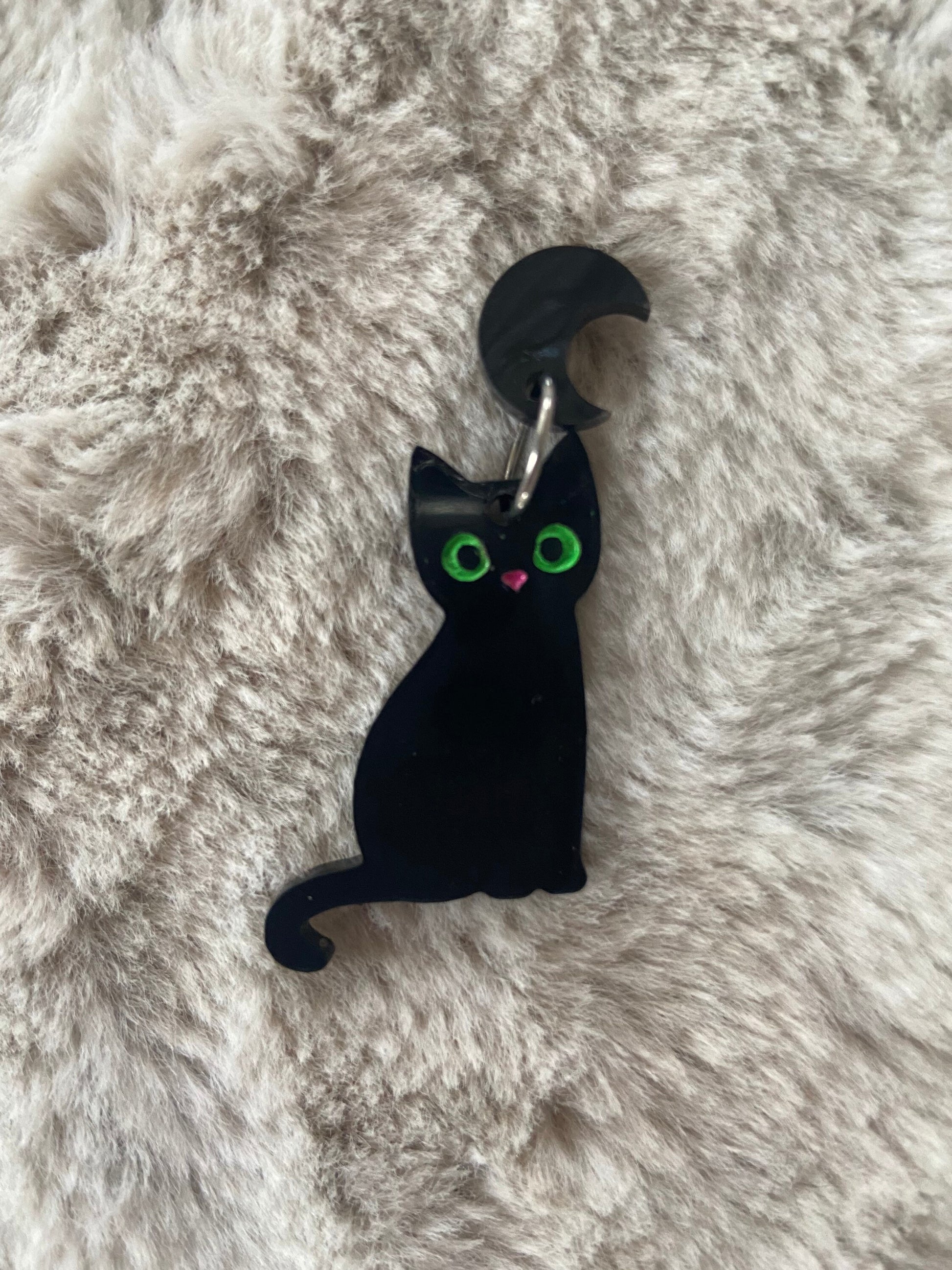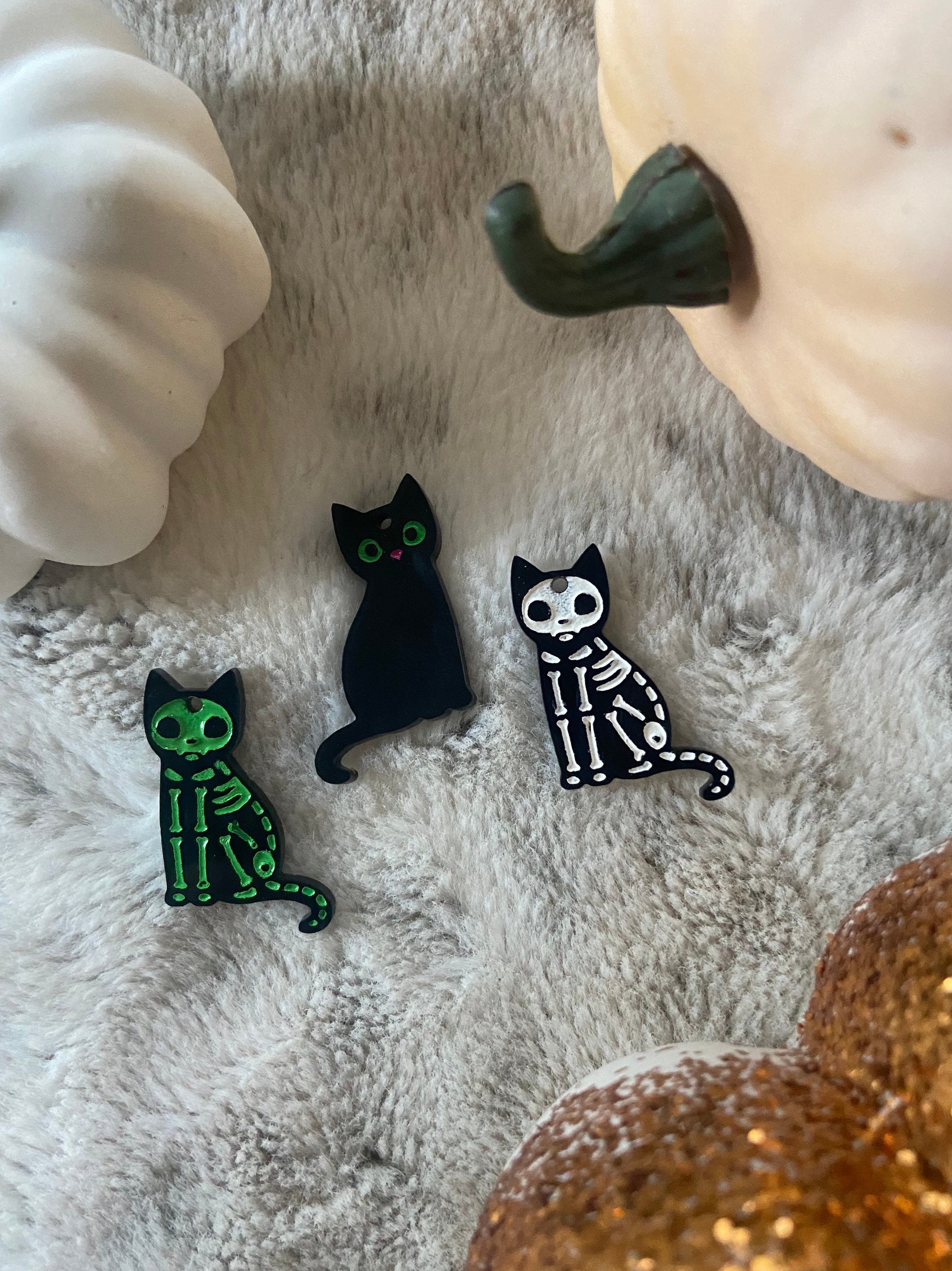 These dangle earrings can be either cute or spooky, the choice is yours! Choose from a pair of cute kitties, pair of skeleton kitties, or even get a mismatched pair to have it both ways! The skeleton kitty is also offered in two colors. The cats are made of black pearl acrylic, which has a subtle pearlescence to it. The cute kitties eyes and nose are engraved and hand painted in green and pink. The skeleton kitties are engraved as well and painted in either green or white. The green skeleton matches the cute kitty nicely, but I wanted to offer a traditional color as well. The closures pictured are acrylic moon stainless steel studs, stainless lever backs, and stainless steel ball studs. The moon studs come in 4 colors: black pearl (same material as the cats), pink pearl, glitter purple, glitter pumpkin spice. Since people prefer different closures, you have the option of selecting between studs, lever backs, and ear wires for your earring closure. If you select a closure other than a moon, your earrings will not have the moon included. The last picture shows an example of your choices. All earrings are hand assembled and designed by me.
