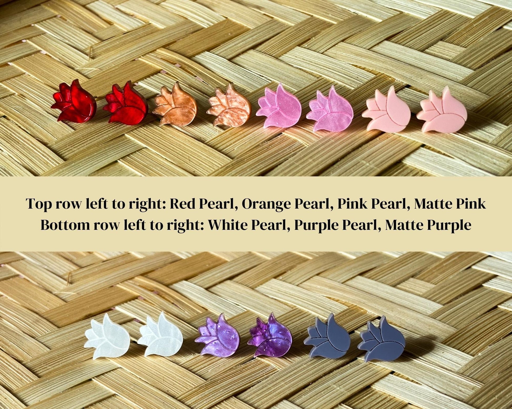 No flower celebrates spring as a much tulips. These tulips stud earrings will perfectly compliment your spring outfits, or any outfit, and come in a variety of colors. The photos show all your available options. The posts and backs are nickel free stainless steel. These are made of laser cut acrylic. The acrylic is thin and lightweight, resulting in a bold look without being heavy. Each earring weighs less than an ounce, which is about the same as a penny. As always, the earrings are designed and assembled by me, Alexis. As is the nature of handmade items, slight variations will occur. Any earrings purchased will be made of the same materials as in the photographs, but many of the acrylics I use are marble or glitter designs and there are subtle variations in these patterns.