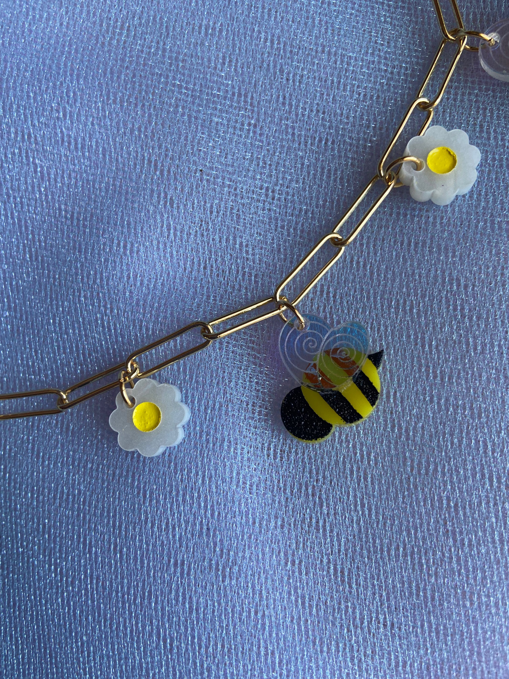 Dainty daisies in a row on this paperclip style chain necklace. Daisy flowers are made of pearlescent white acrylic with hand painted yellow centers. The bumble bees are yellow and black with iridescent wings.