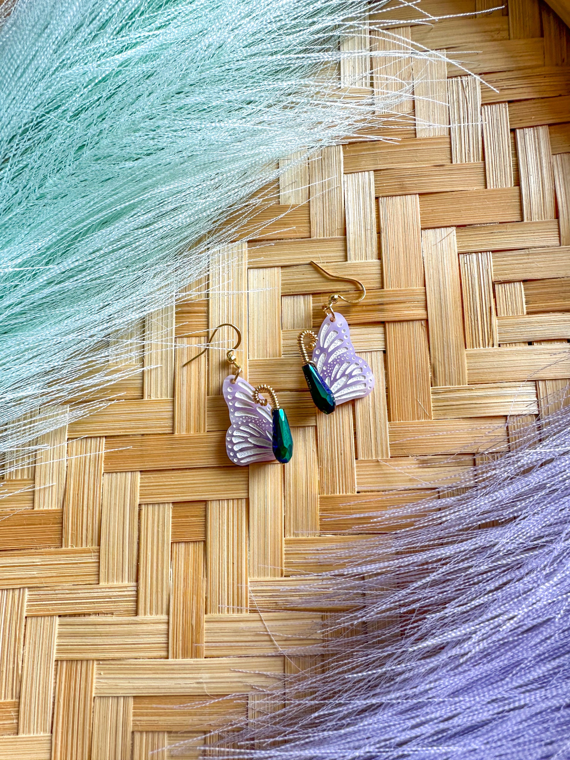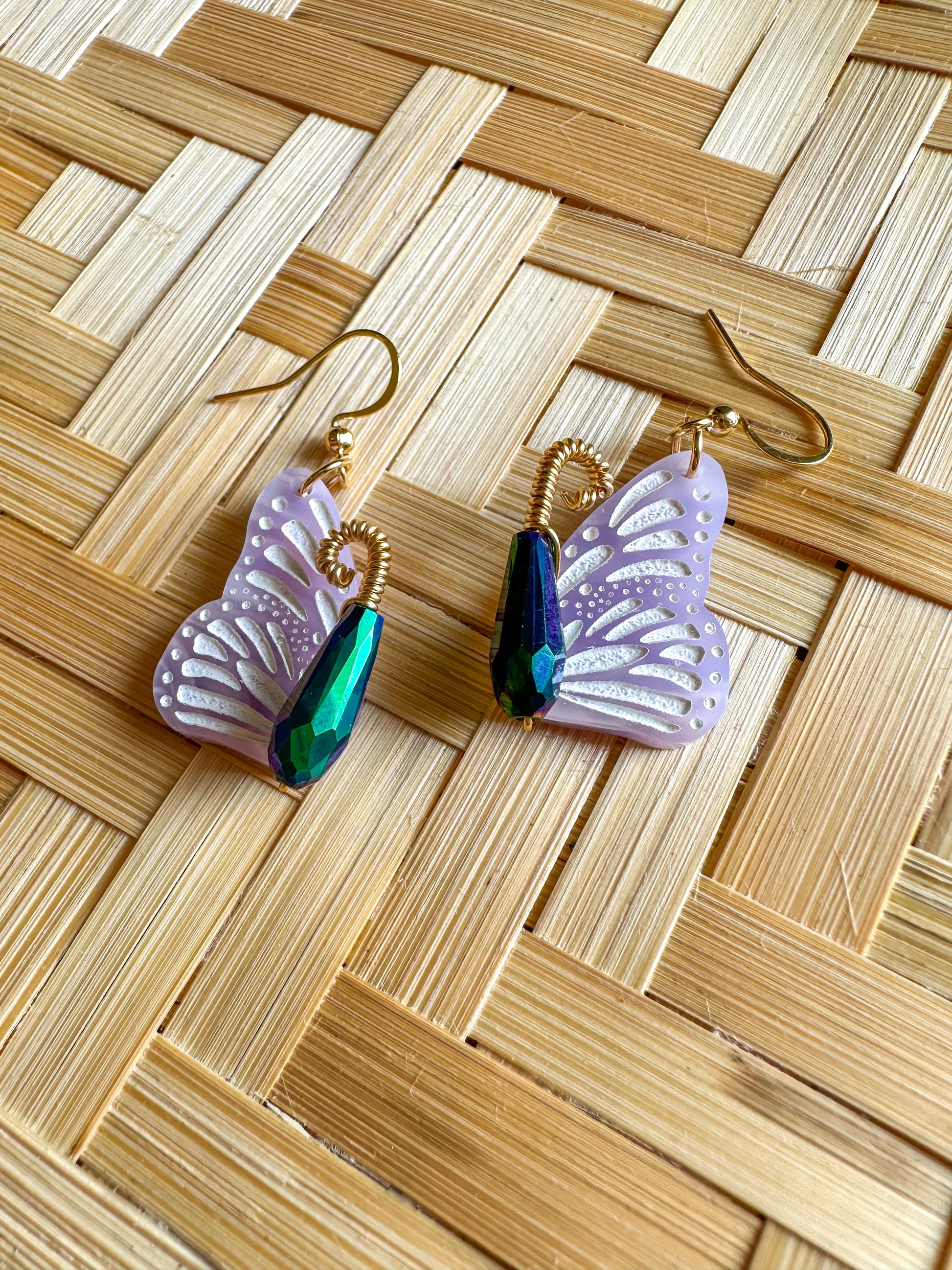 Whimsical earrings made of glass, gold wire, and acrylic. The butterflies are a swirl of purple and pinks with delicate gold feelers and an iridescent, glass bead body.