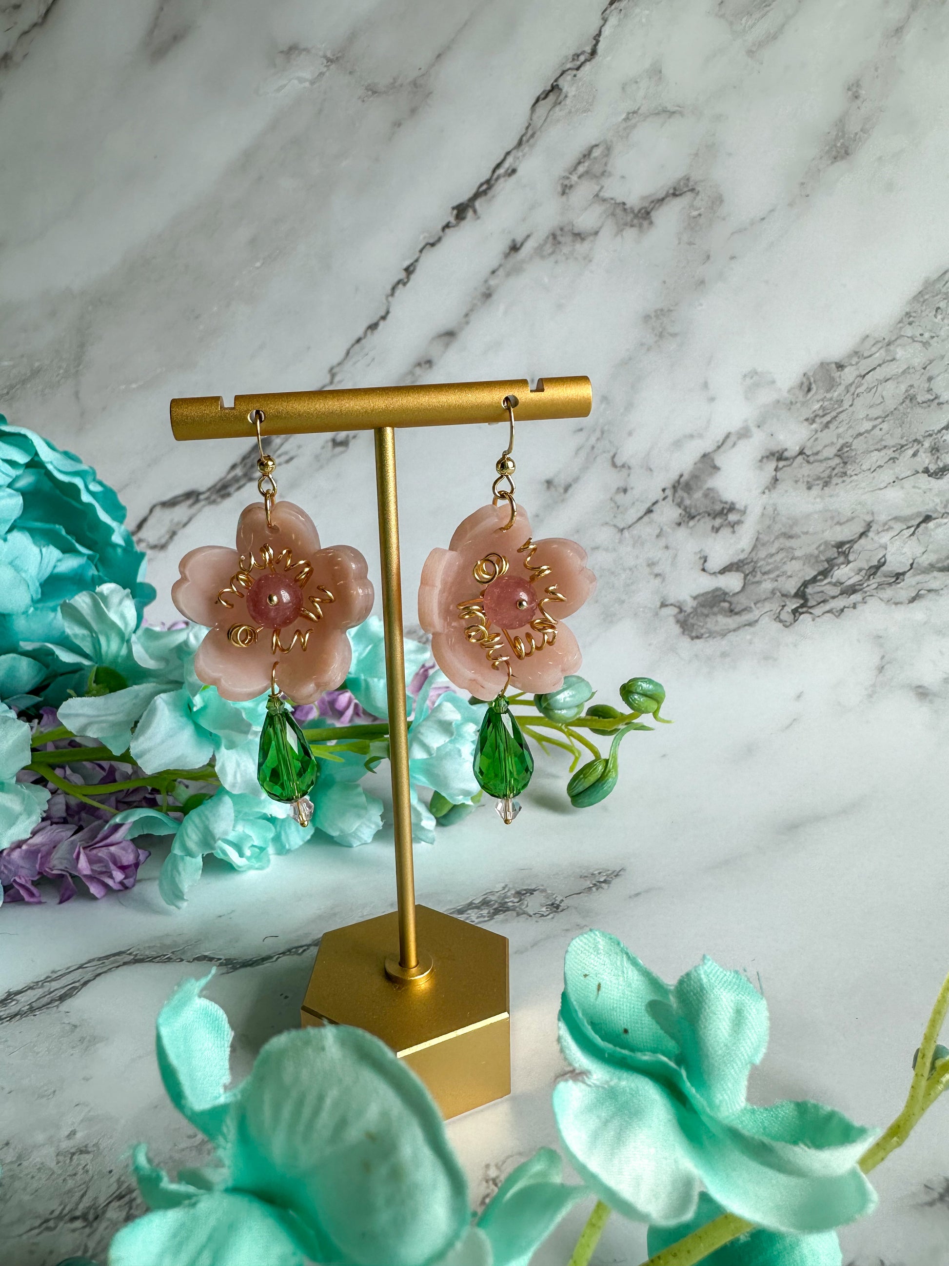 These earrings are delicate with a statement, the perfect spring earrings that can also be worn all summer. The blossoms are made of rosy acrylic molded into petals by hand. The flower centers are accented with strawberry quartz beads and gold wire. Glass beads dangle from the blooms adding some subtle sparkle. A matching pendant necklace is also available.