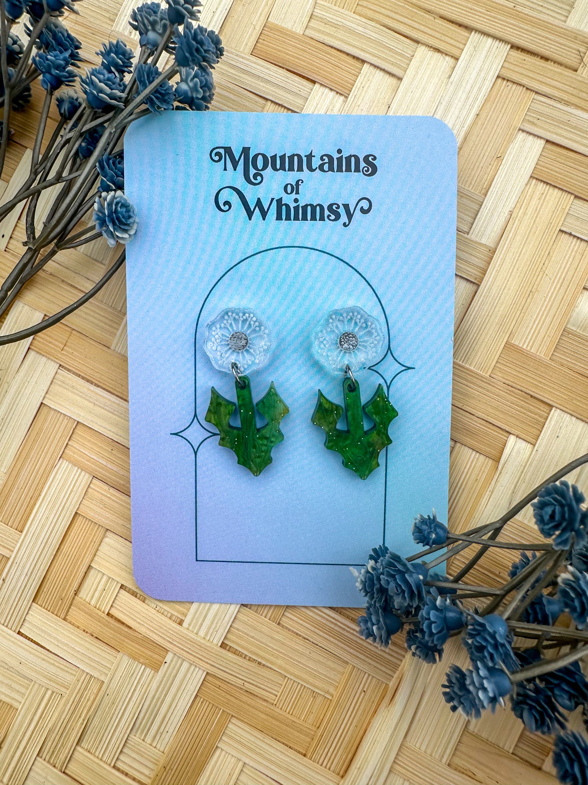 Part of our mini dangle earring collection, these earrings are a smaller dose of whimsy to add to your look. The dandelion puffs make up the stud and the stem dangles below. The studs are made with nickel free stainless steel.