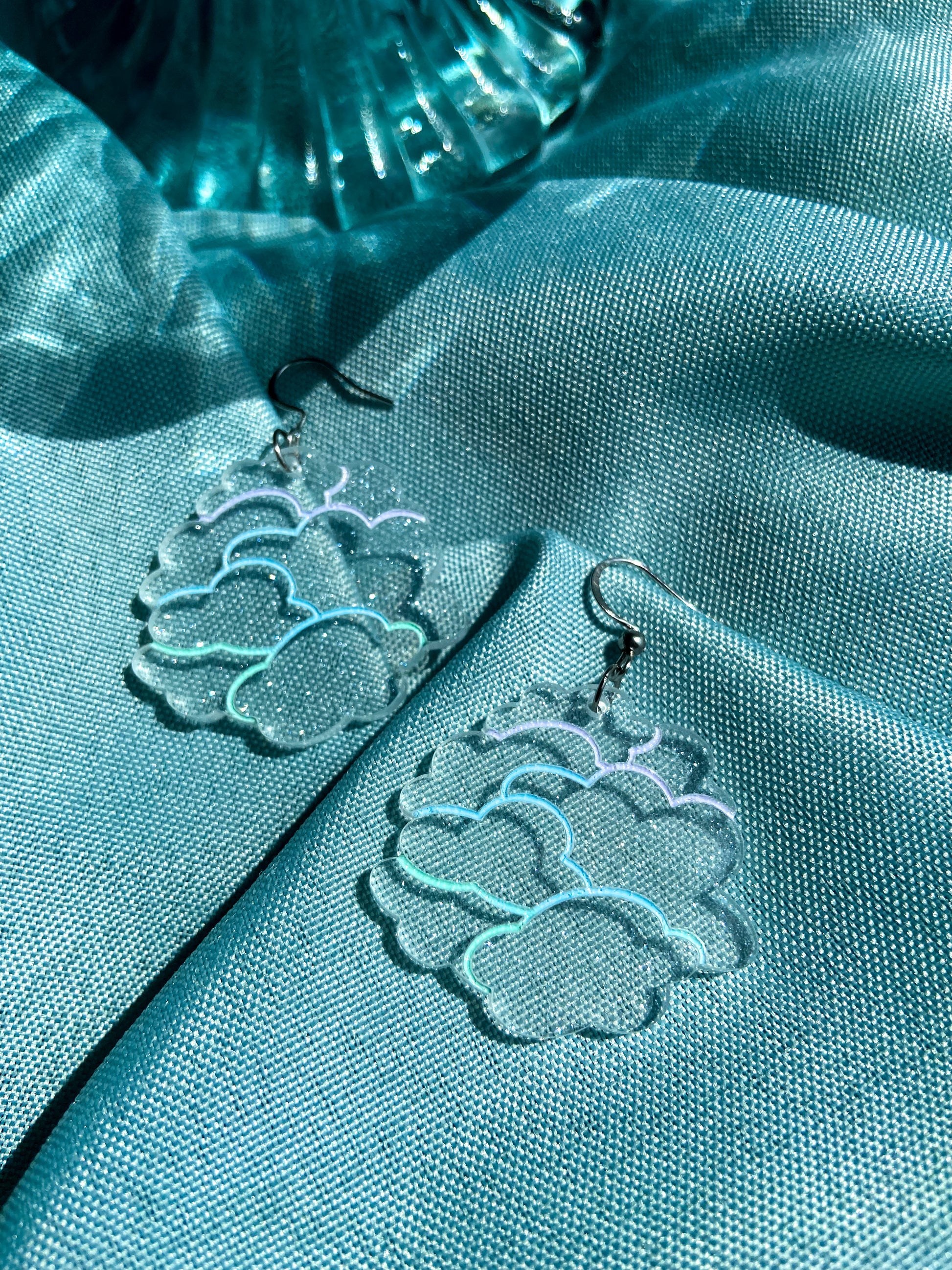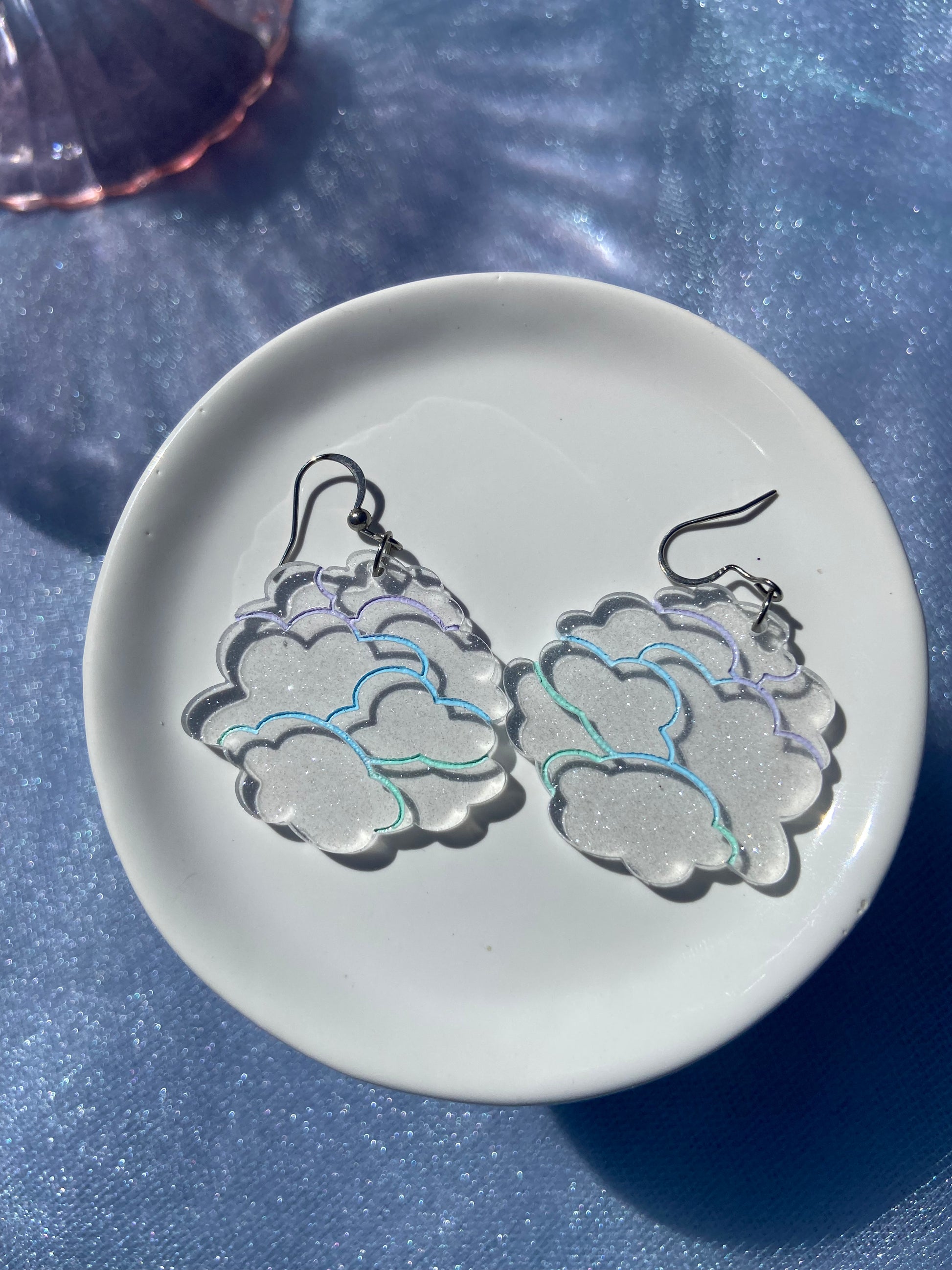 This whimsical design is subtle and sparkly all at once. The earrings are made of stardust acrylic, which is clear with a fine shimmering glitter throughout. The clouds' silhouettes are engraved and hand painted in pastel colors.