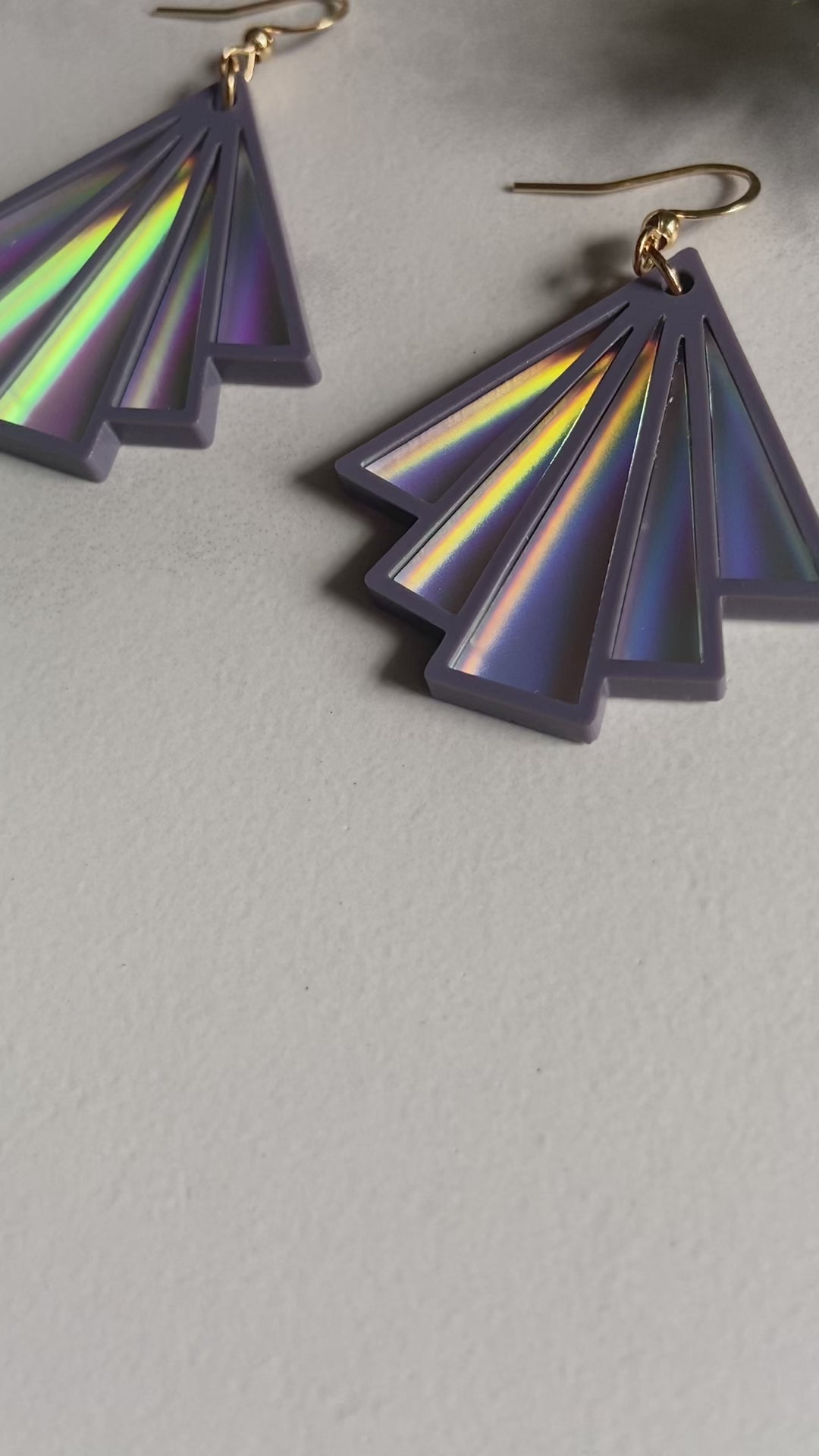These earrings are inspired by the shapes and glamor of Art Deco design. Made from laser cut acrylic in a variety of colors. The pieces of this design are inlaid together and sealed with resin for extra security. Featured is iced plum With a plum frame and iridescent inserts.