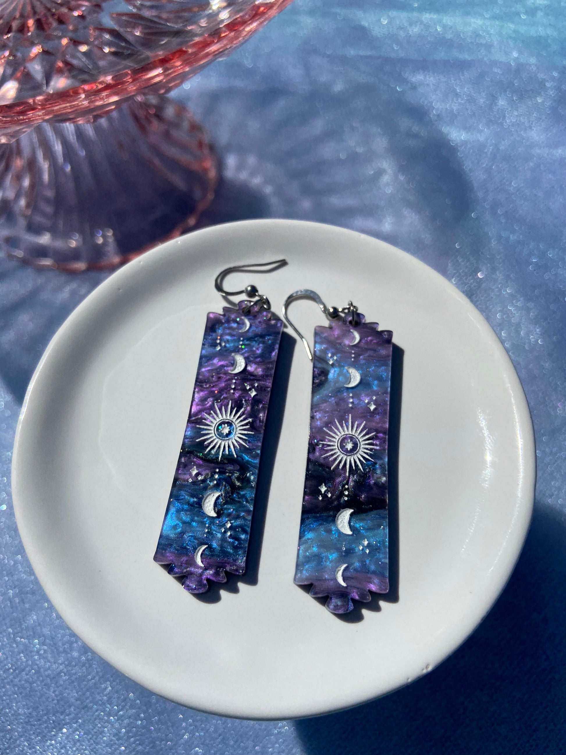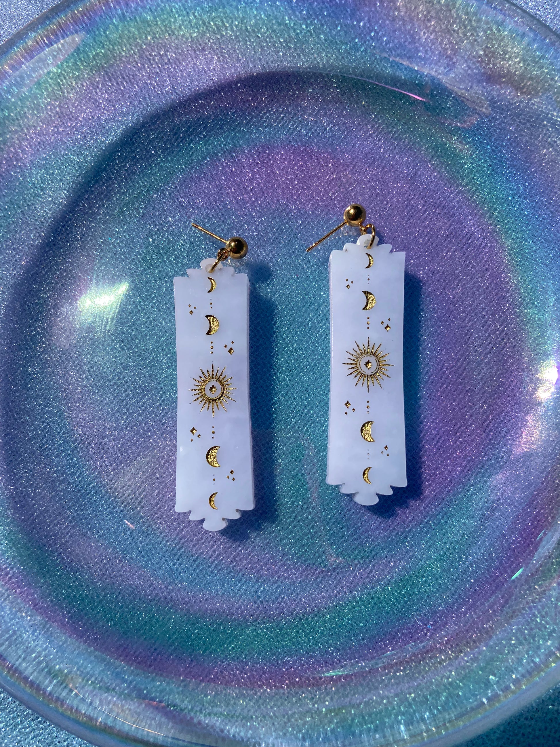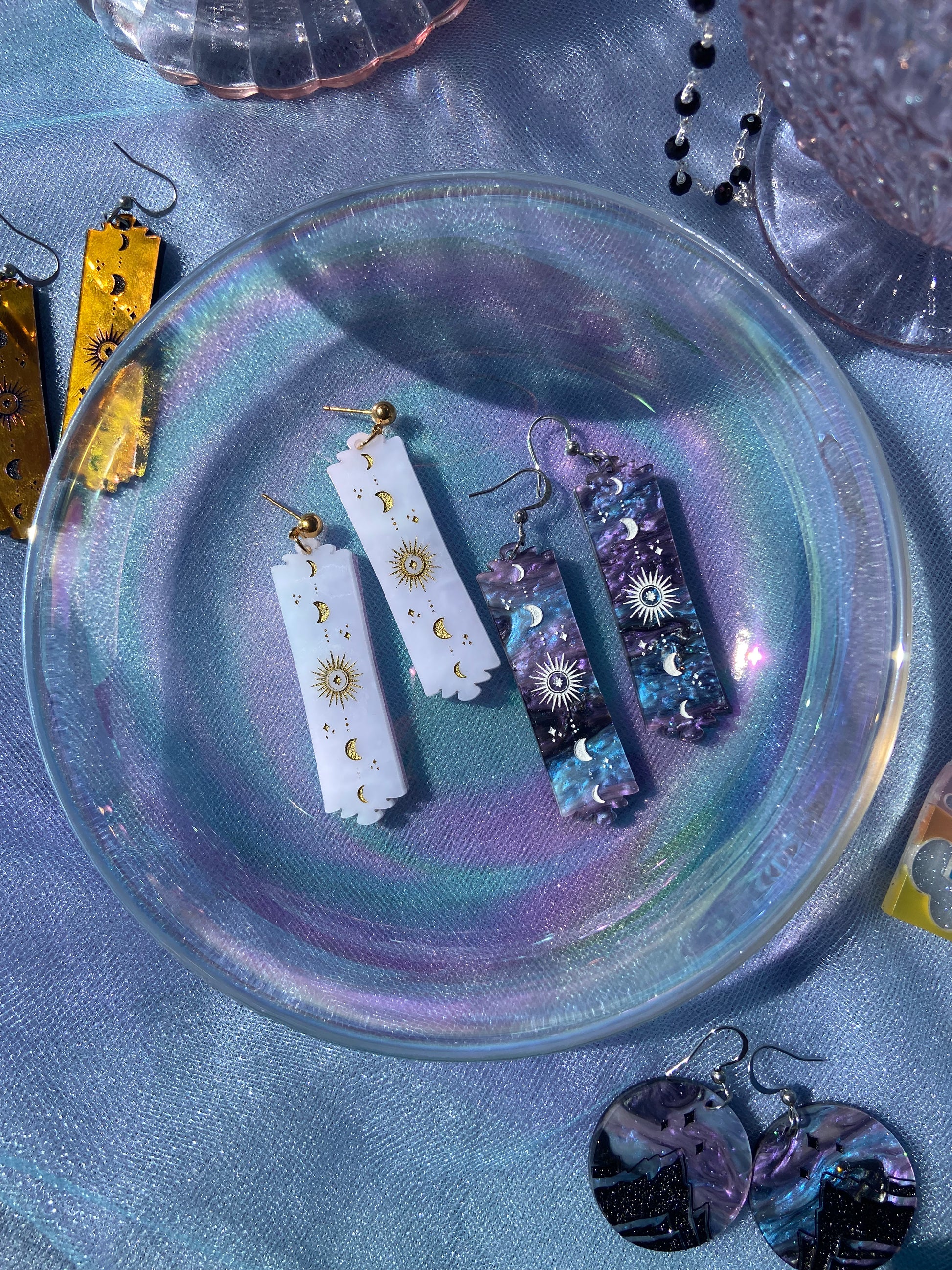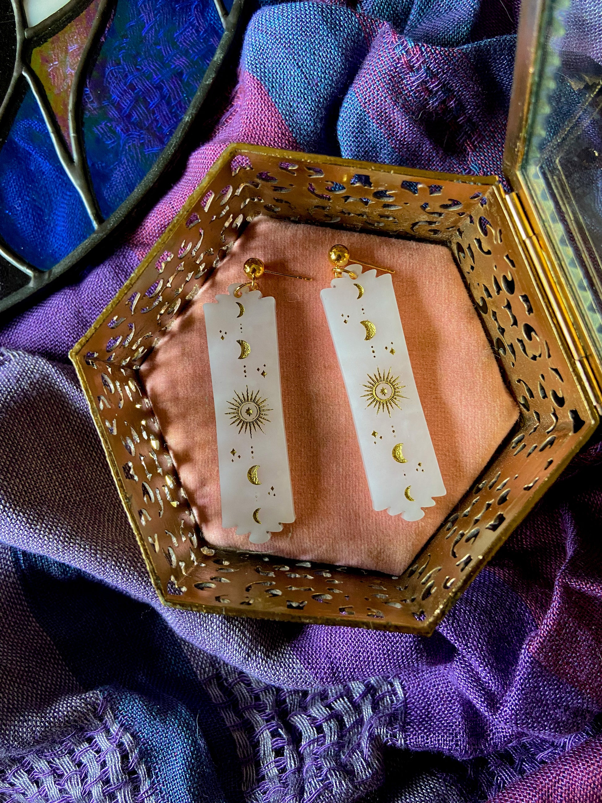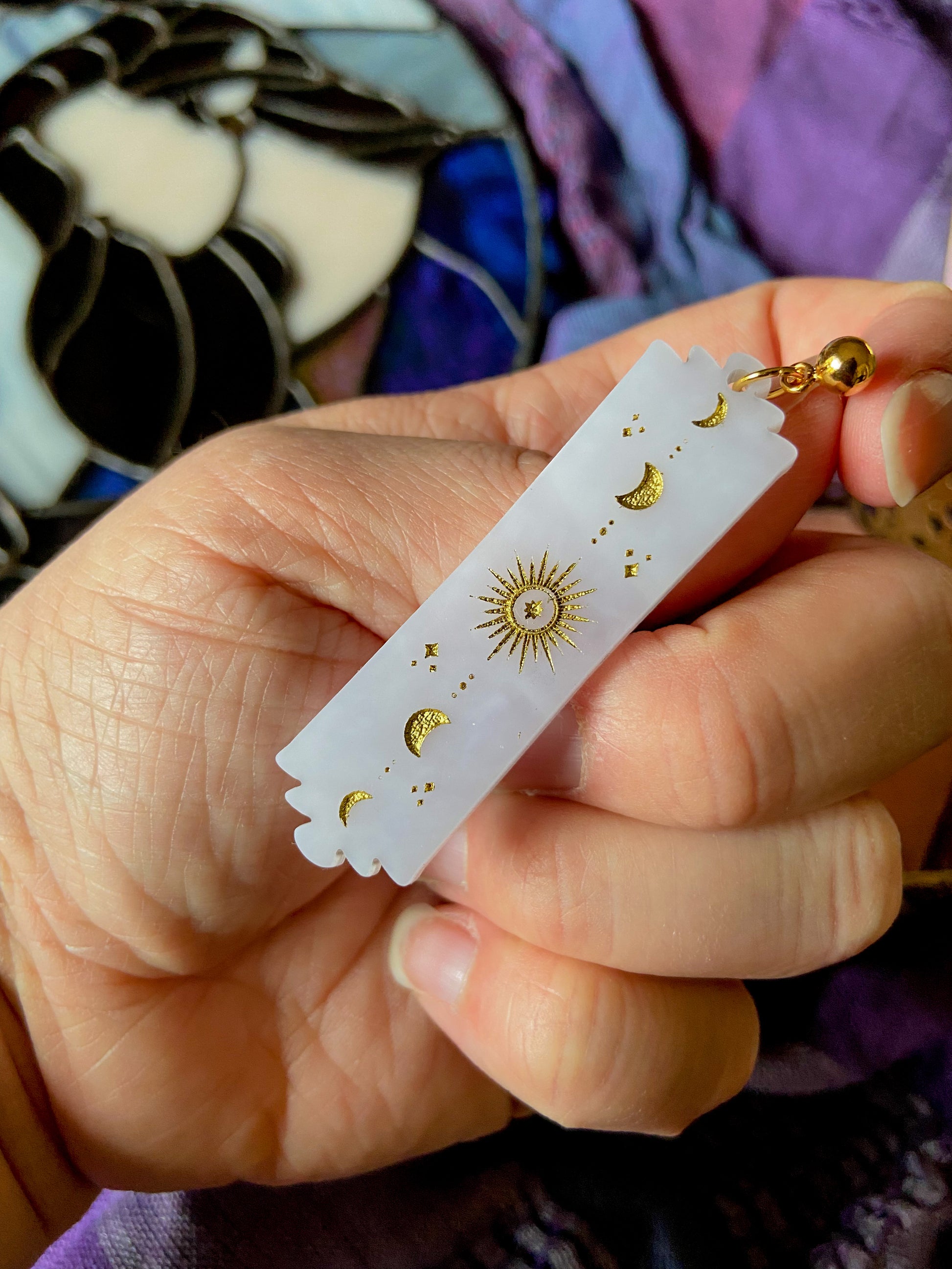 This design is inspired by ACOTAR and the tattoo Feyre receives after her bargain with Braxis. The moon phases and stars are engraved and hand painted into each piece. There are three colorway choices for this design - white quartz, midnight sky, or dark iridescent. Every pair is subtly unique due to the abstract swirl of the acrylic. This design is versatile in being bookish for fans of ACOTAR, yet subtle enough for the everyday.