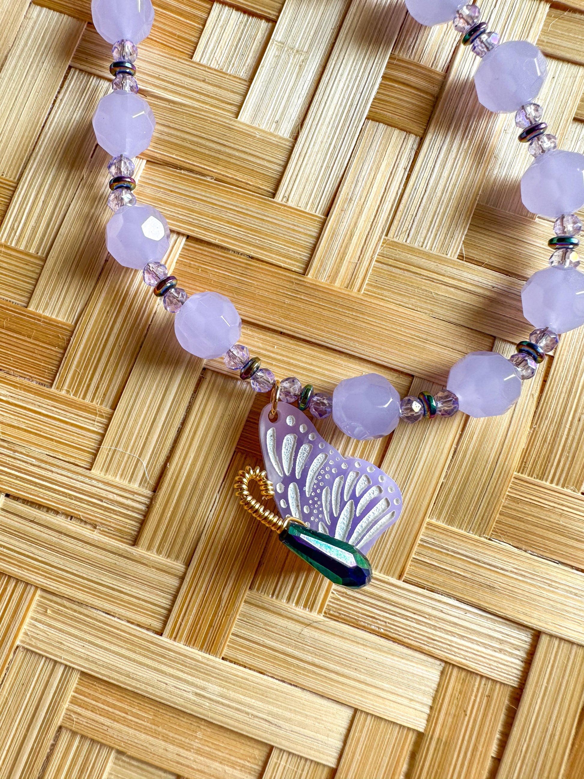 beaded necklace of glass beads and iridescent hematite beads. A handmade butterfly pendant is the centerpiece. The necklace length is 16” with a 1" extender.