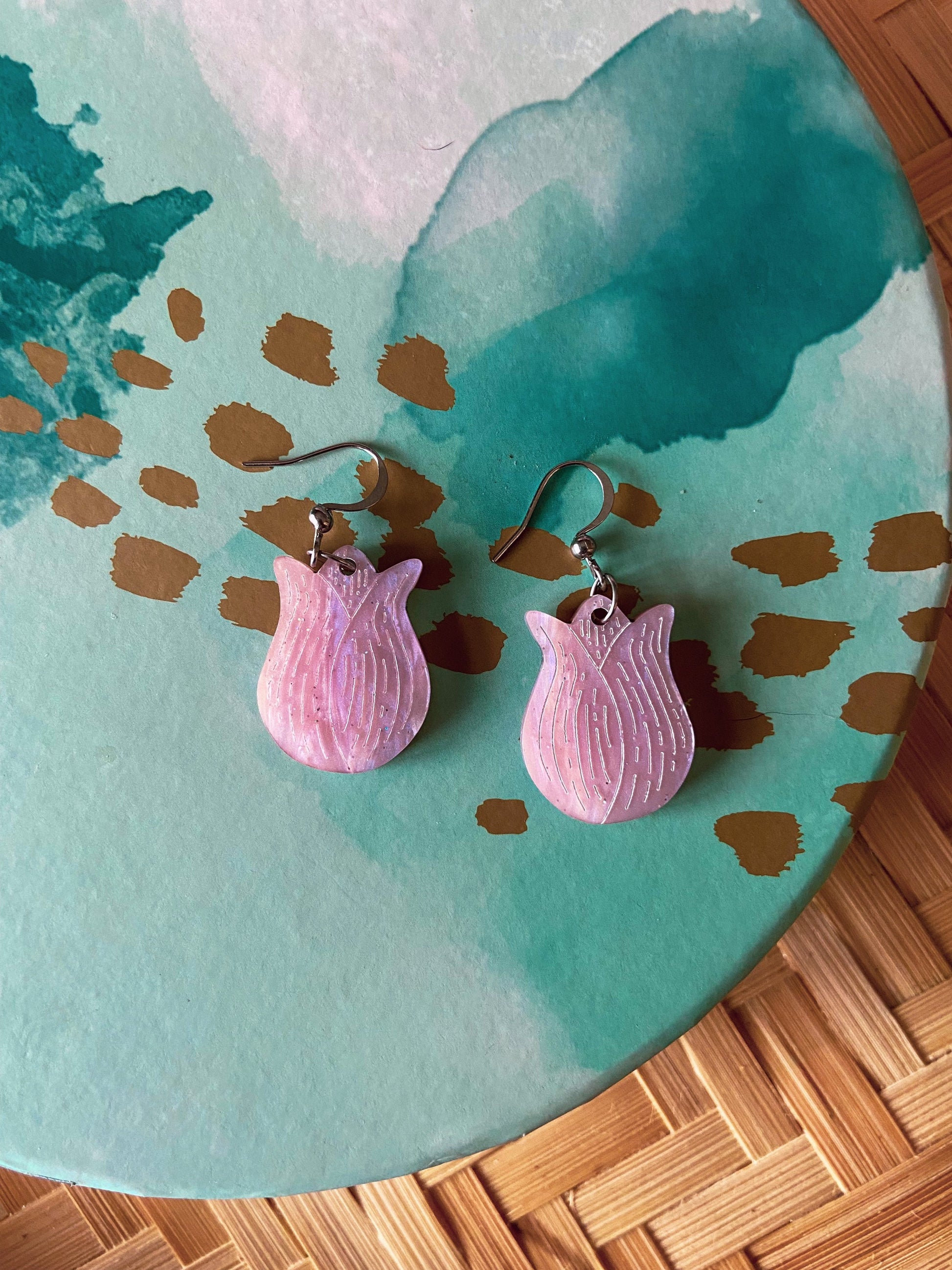 No flower celebrates spring as a much tulips. These dangle earrings were inspired by the detail and lines of botanical illustration. The detail is engraved onto the surface of the earrings and hand painted. The photos show all your available options. The closure pictured is ear wire. Since people prefer different closures, you have the option of selecting between studs, lever backs, and ear wires for your earring closure. The last picture shows an example of your choices. All earrings are hand assembled and designed by me. These are made of laser cut acrylic. The acrylic is thin and lightweight, resulting in a bold look without being heavy. Each earring weighs less than an ounce, which is about the same as a penny. As always, the earrings are designed and assembled by me, Alexis. As is the nature of handmade items, slight variations will occur. Any earrings purchased will be made of the same materials as in the photographs, but many of the acrylics I use are marble or glitter designs and there are subtle variations in these patterns.