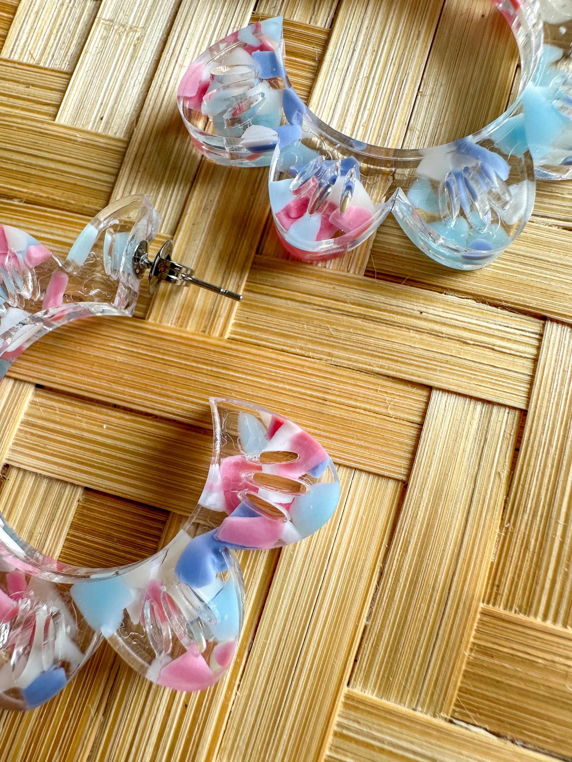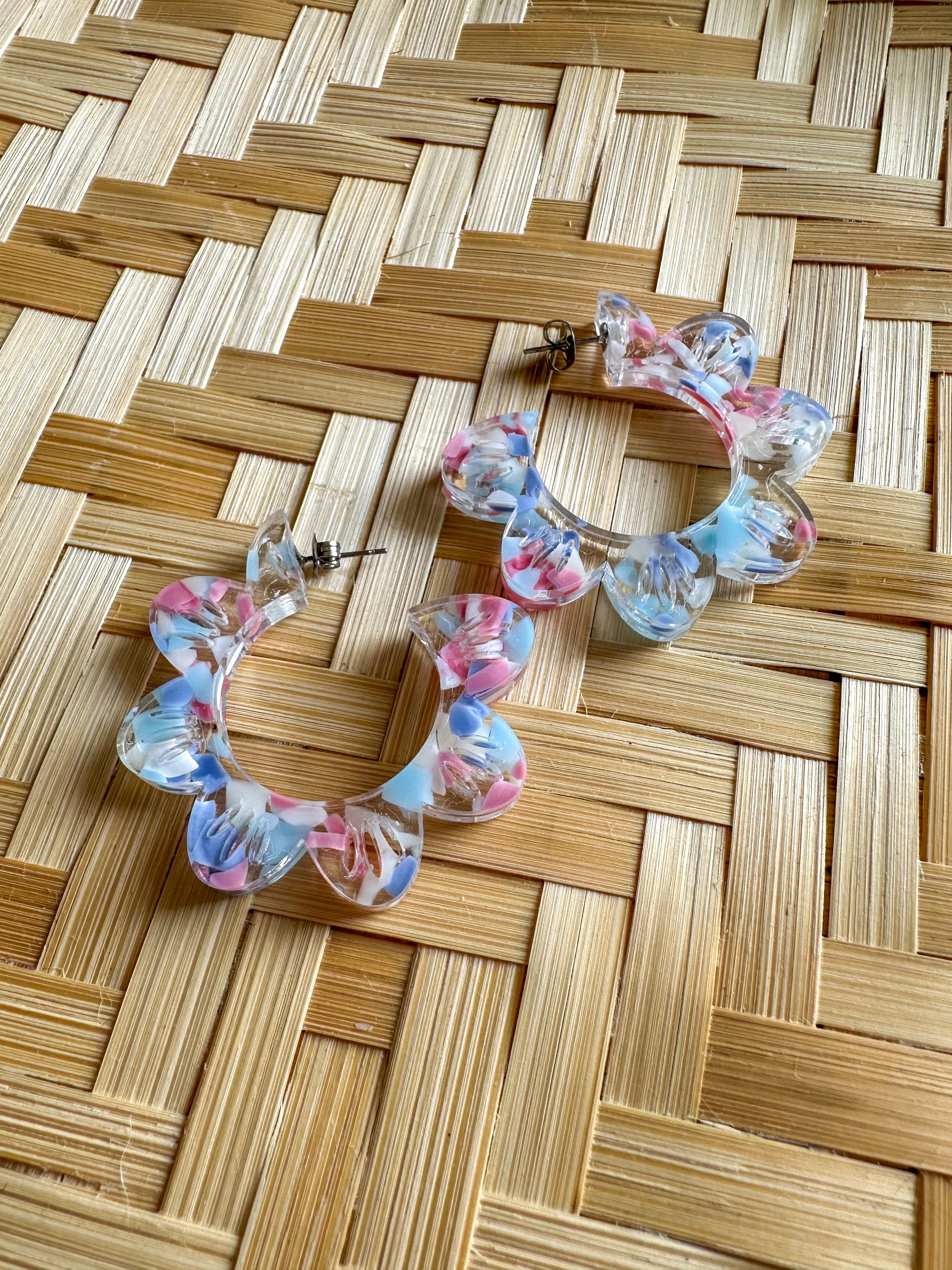 Bold, floral hoops perfect for year round. These are a clear acrylic with flocks of pinks and blues throughout giving it a terrazzo look.