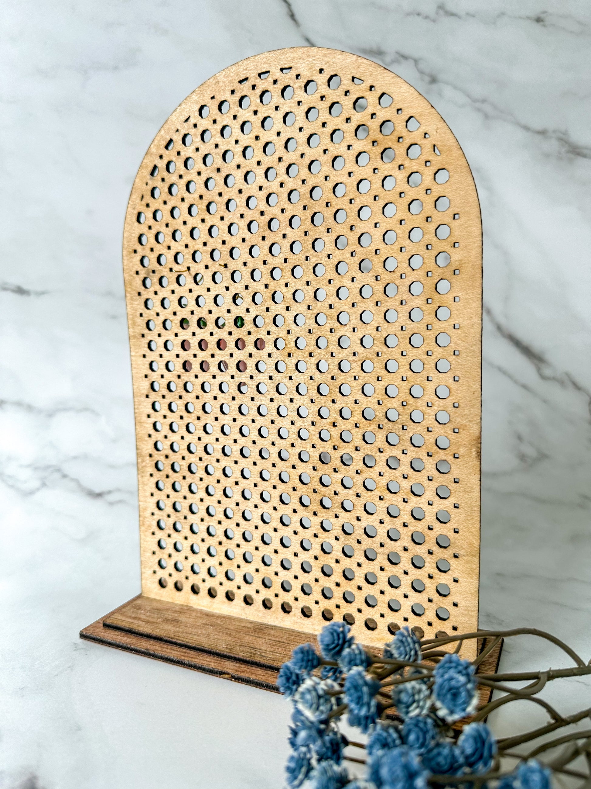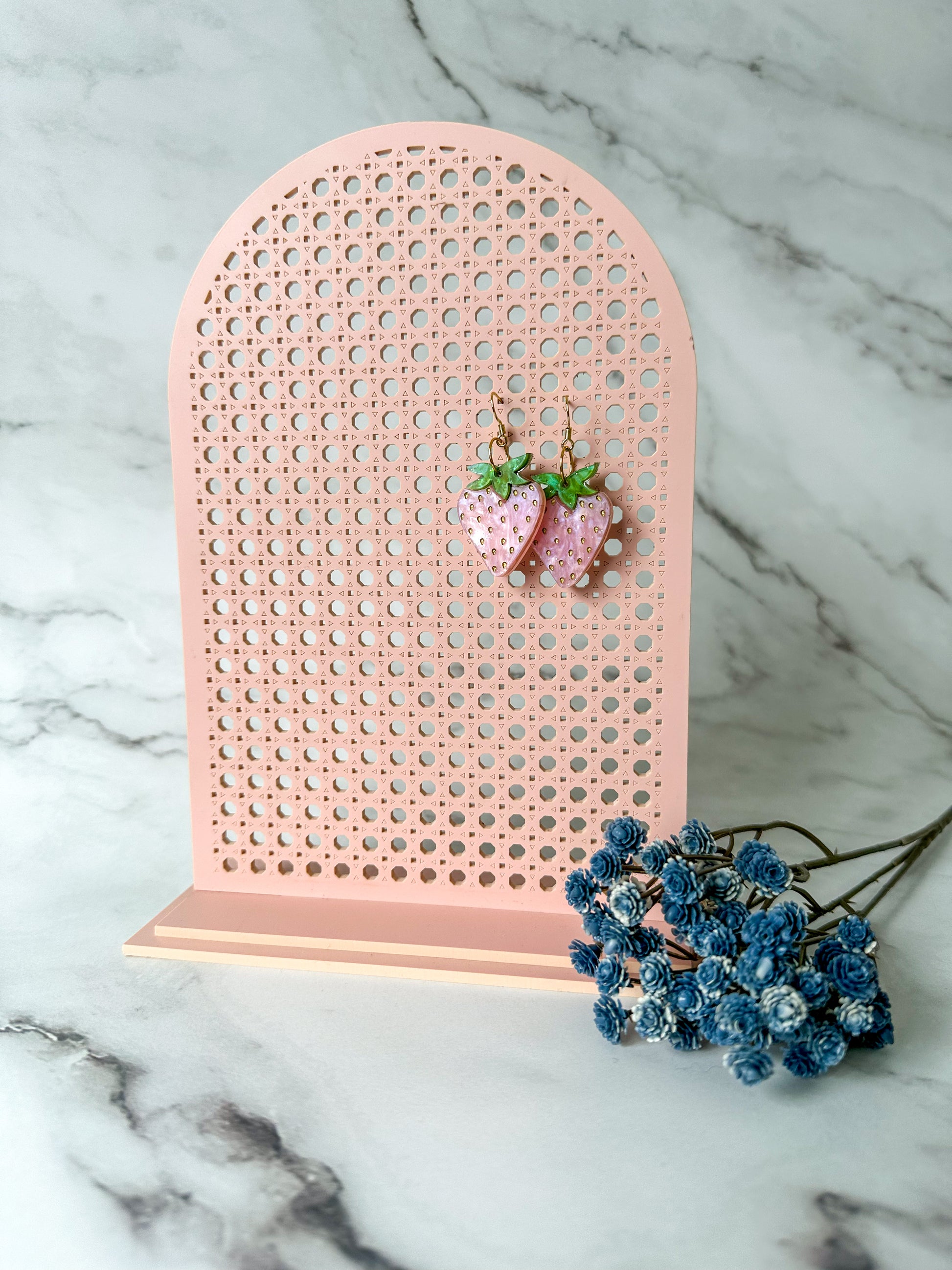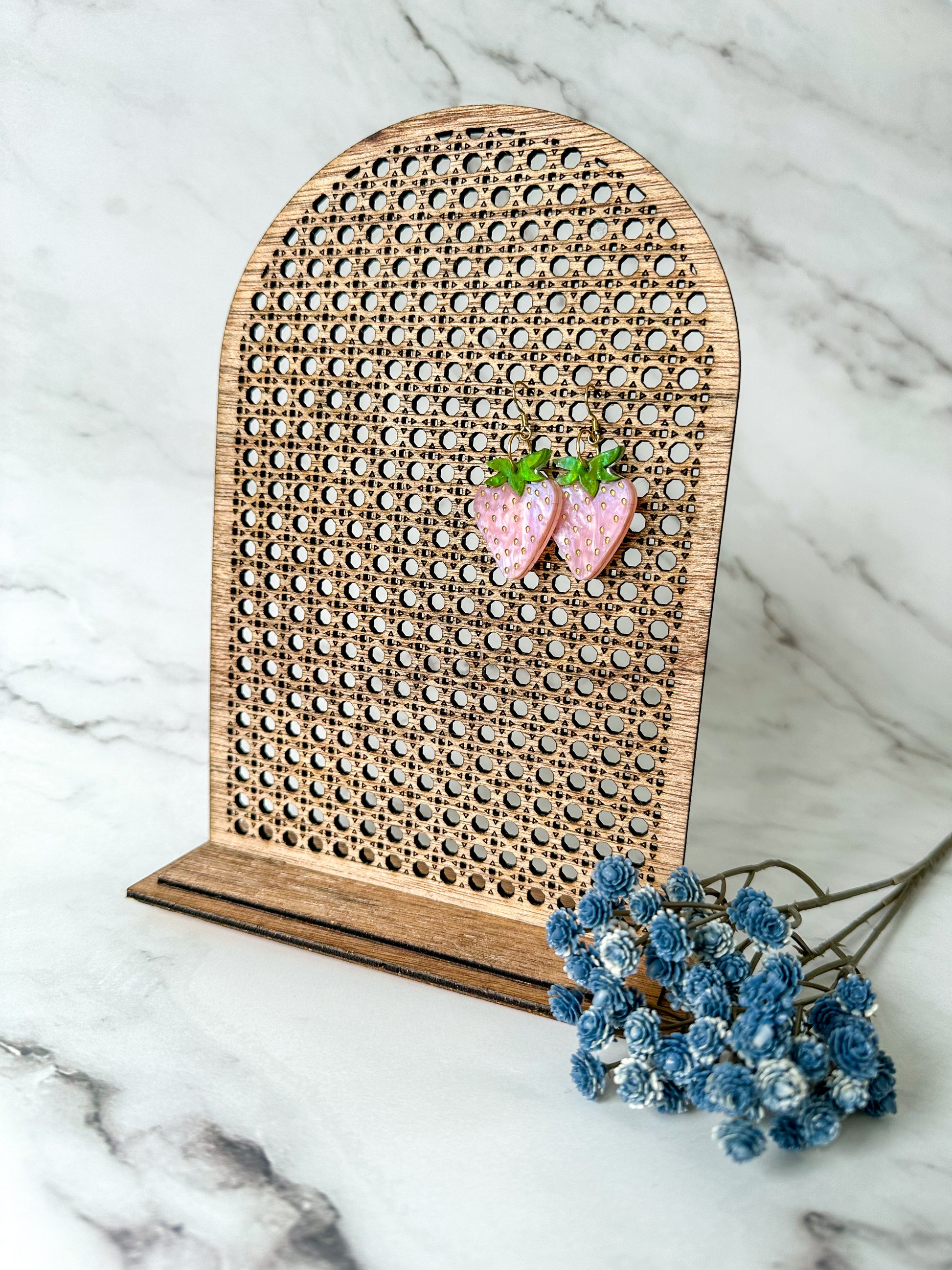 These earring stands are a beautiful way to store and showcase your earring collection. The rattan design is cut into the stand giving it a vintage vibe. Earrings can be put through the large or small holes, and the holes can accommodate studs and dangle earrings.