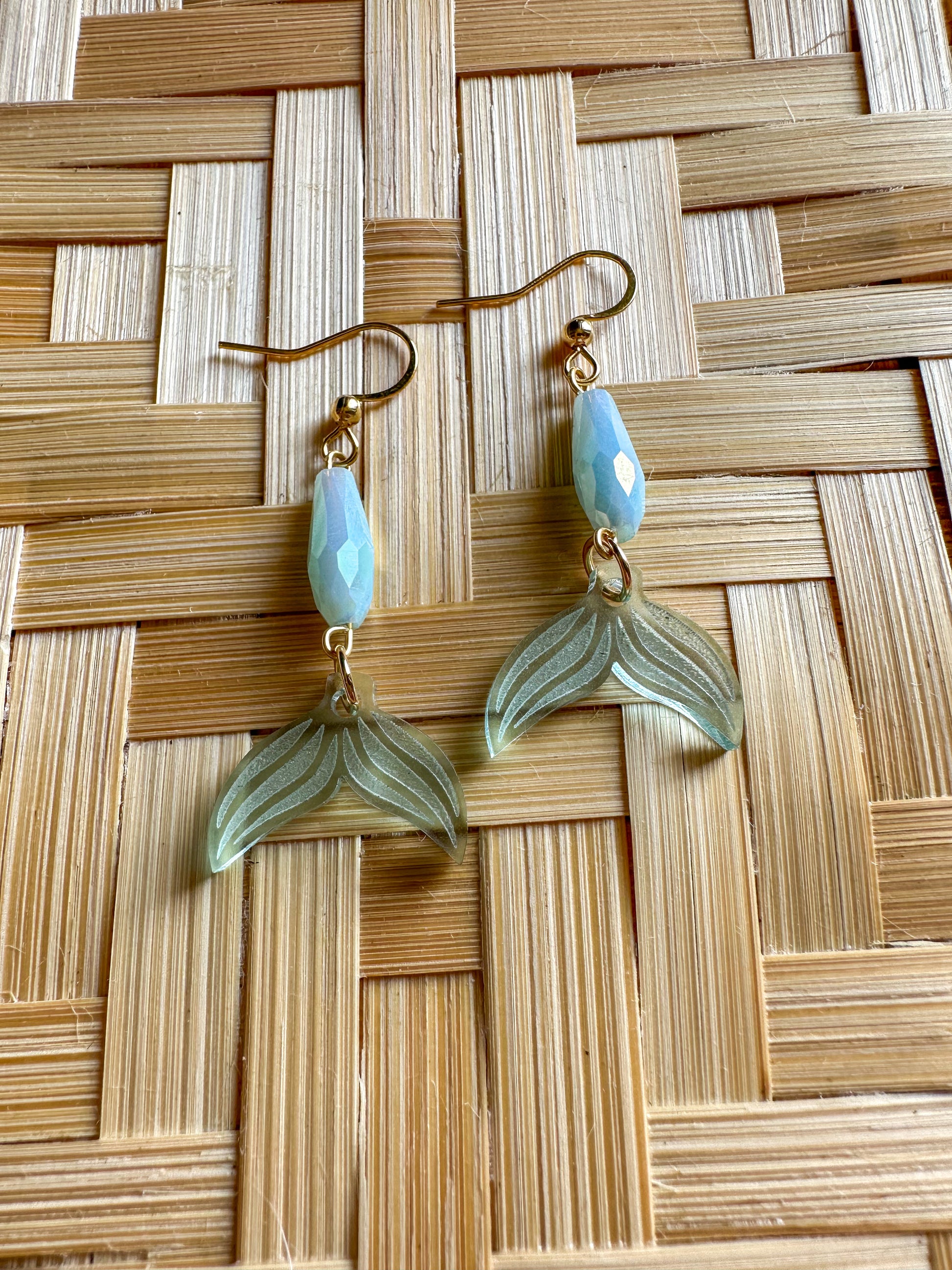 Mermaid tail earrings made of iridescent glass and acrylic.