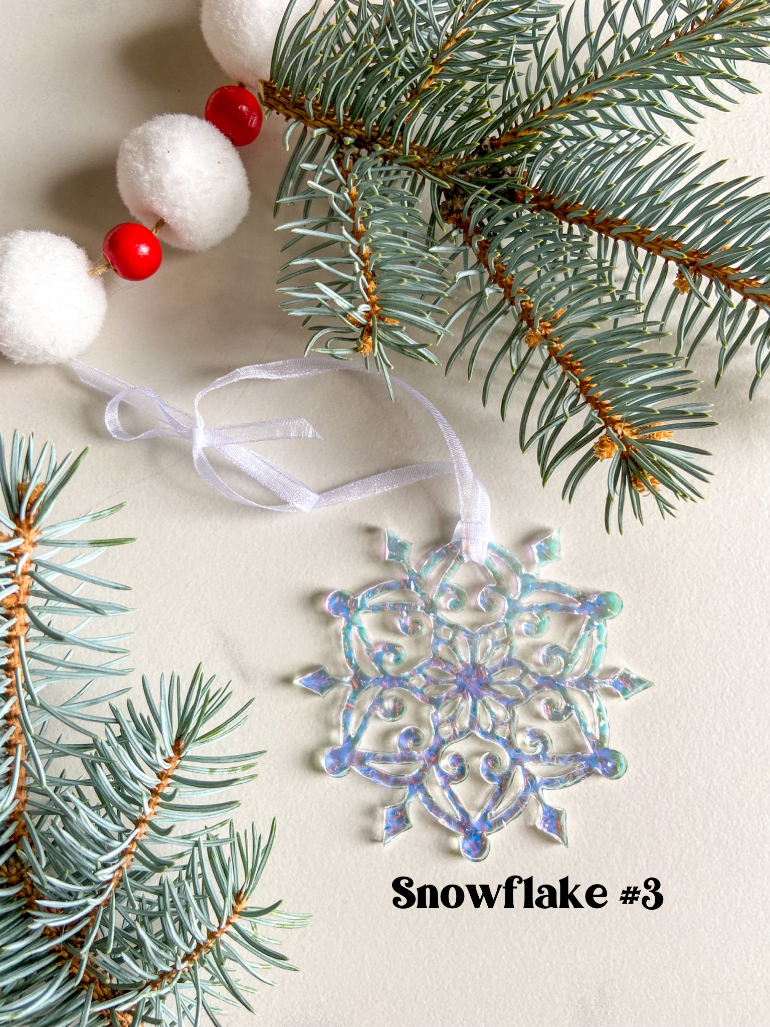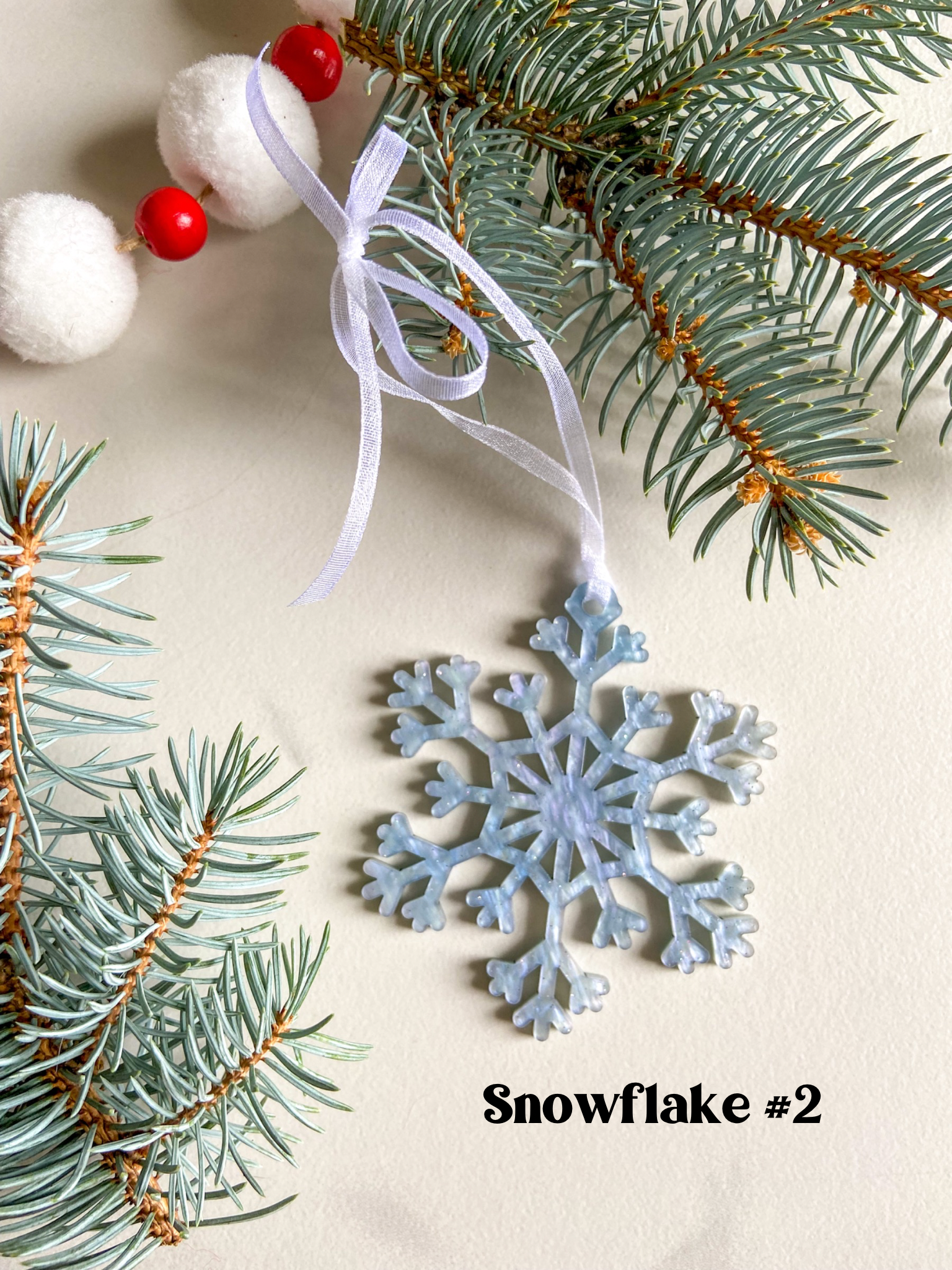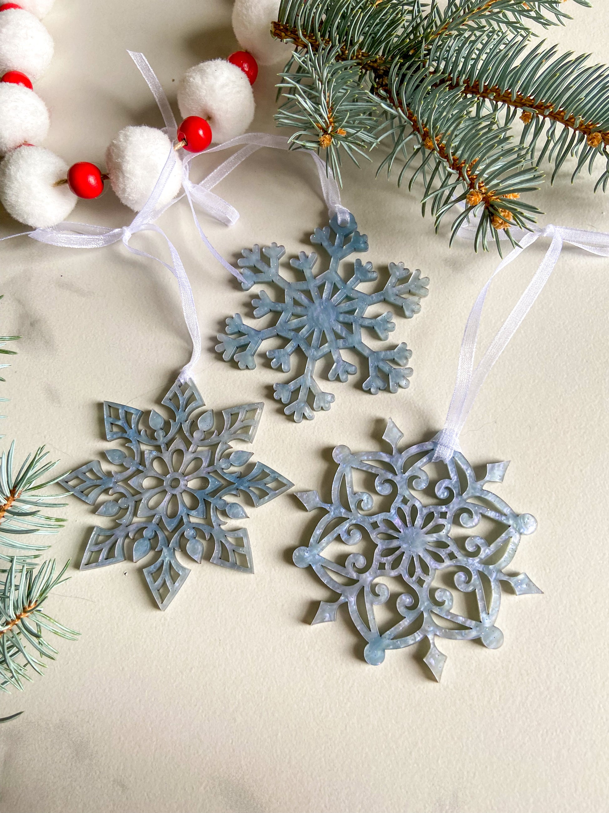 Delicate snowflakes perfect for Christmas and winter decorating. Available in two options: wintry blue and iridescent ice. Wintry blue is pearlescent and shimmers in the light. The iridescent ice is textured like true ice and color shifts between blues and warm tones.