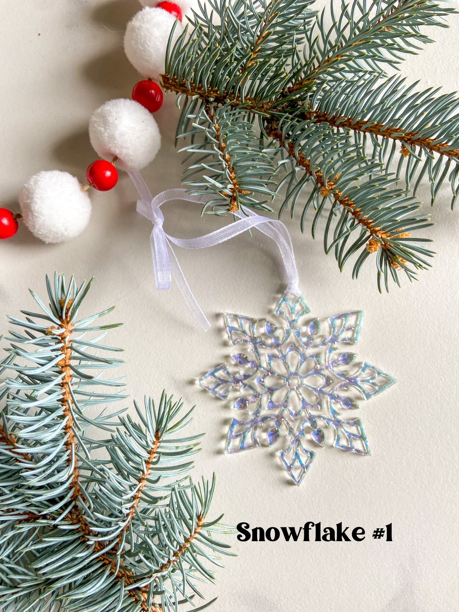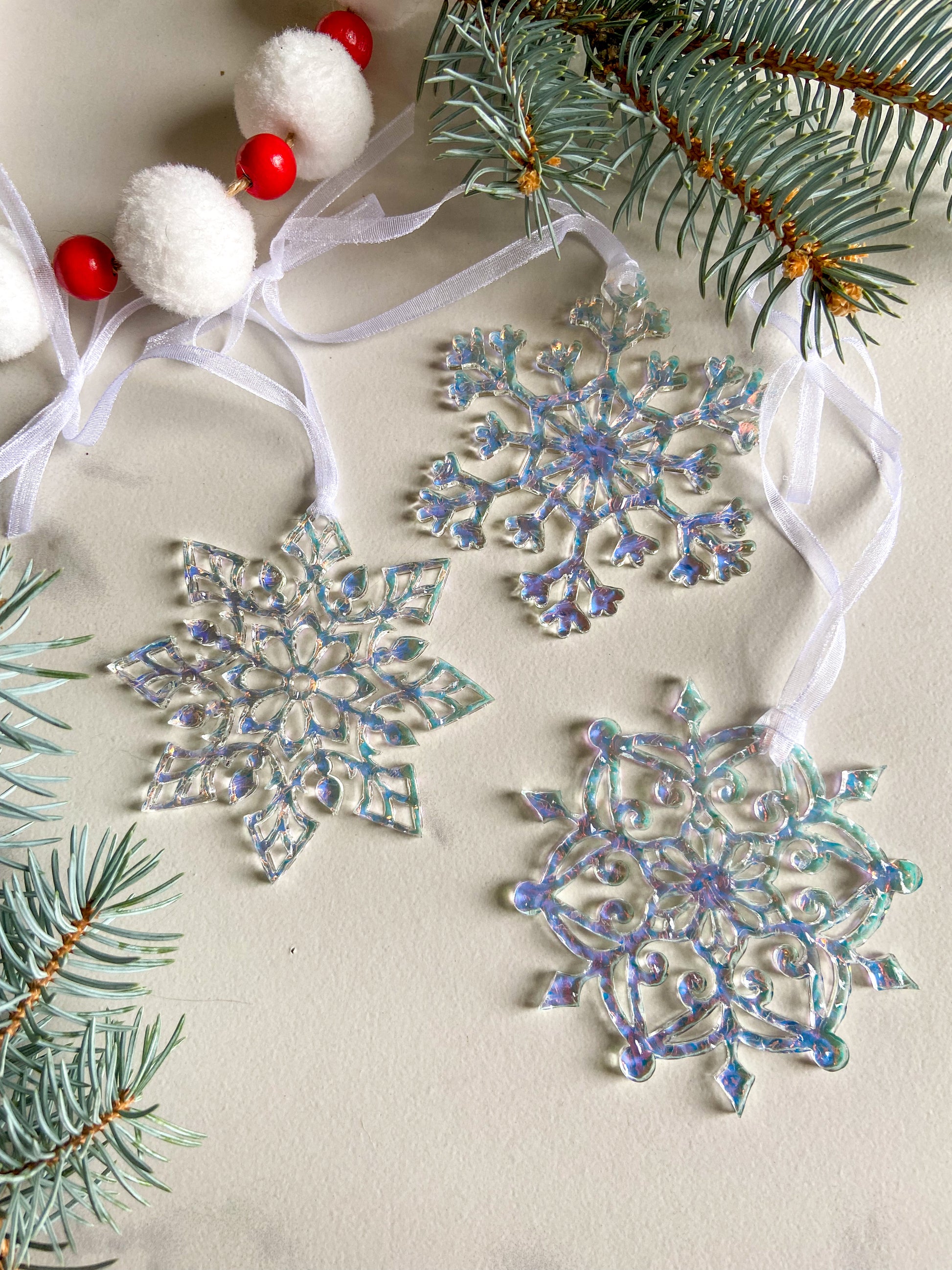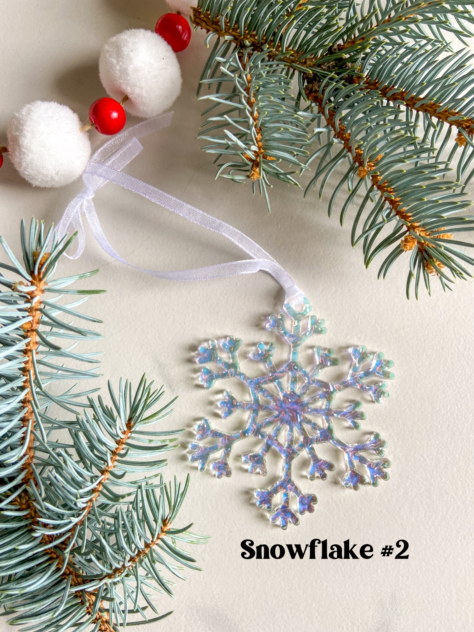 Delicate snowflakes perfect for Christmas and winter decorating. Available in two options: wintry blue and iridescent ice. Wintry blue is pearlescent and shimmers in the light. The iridescent ice is textured like true ice and color shifts between blues and warm tones.