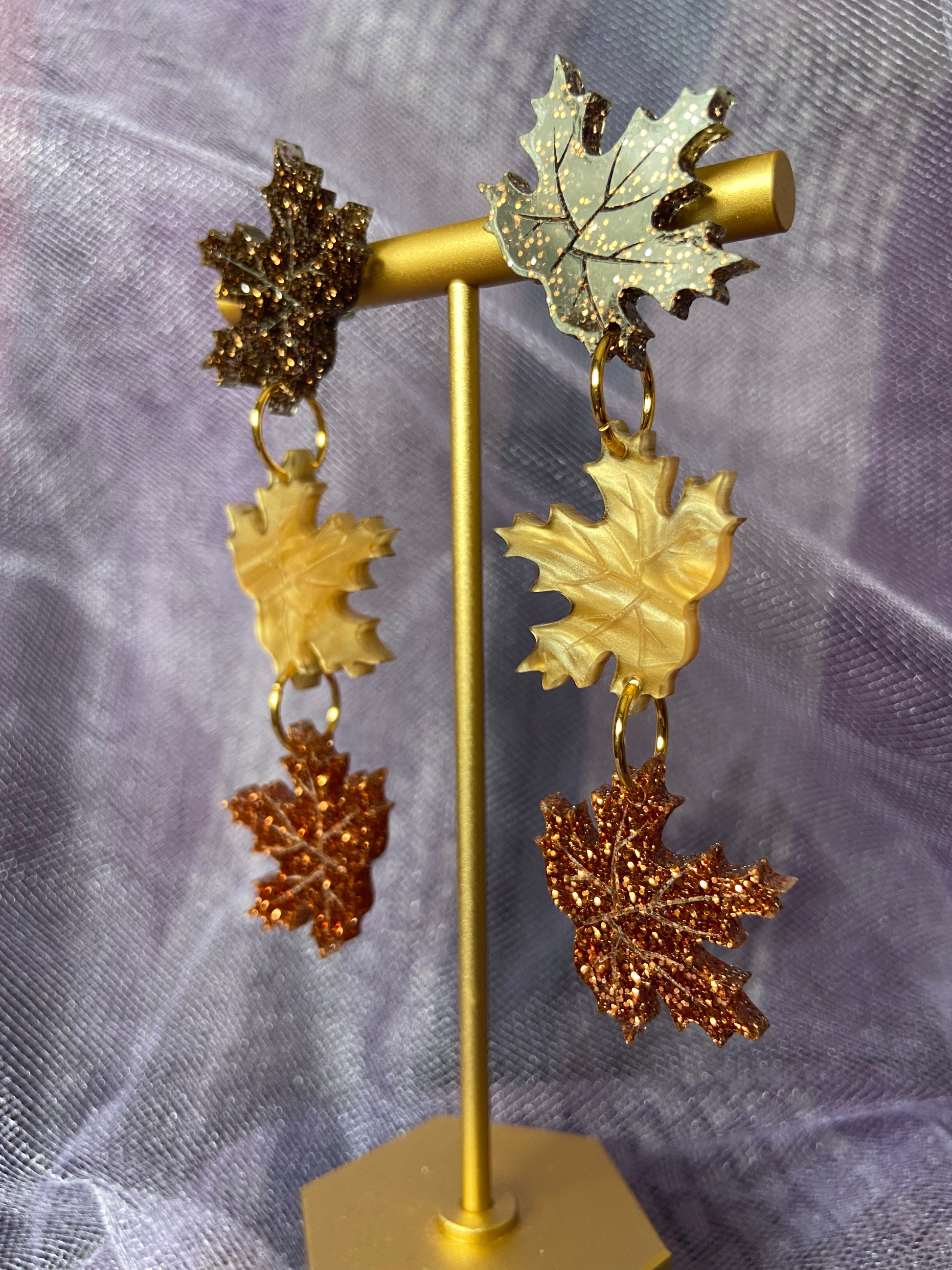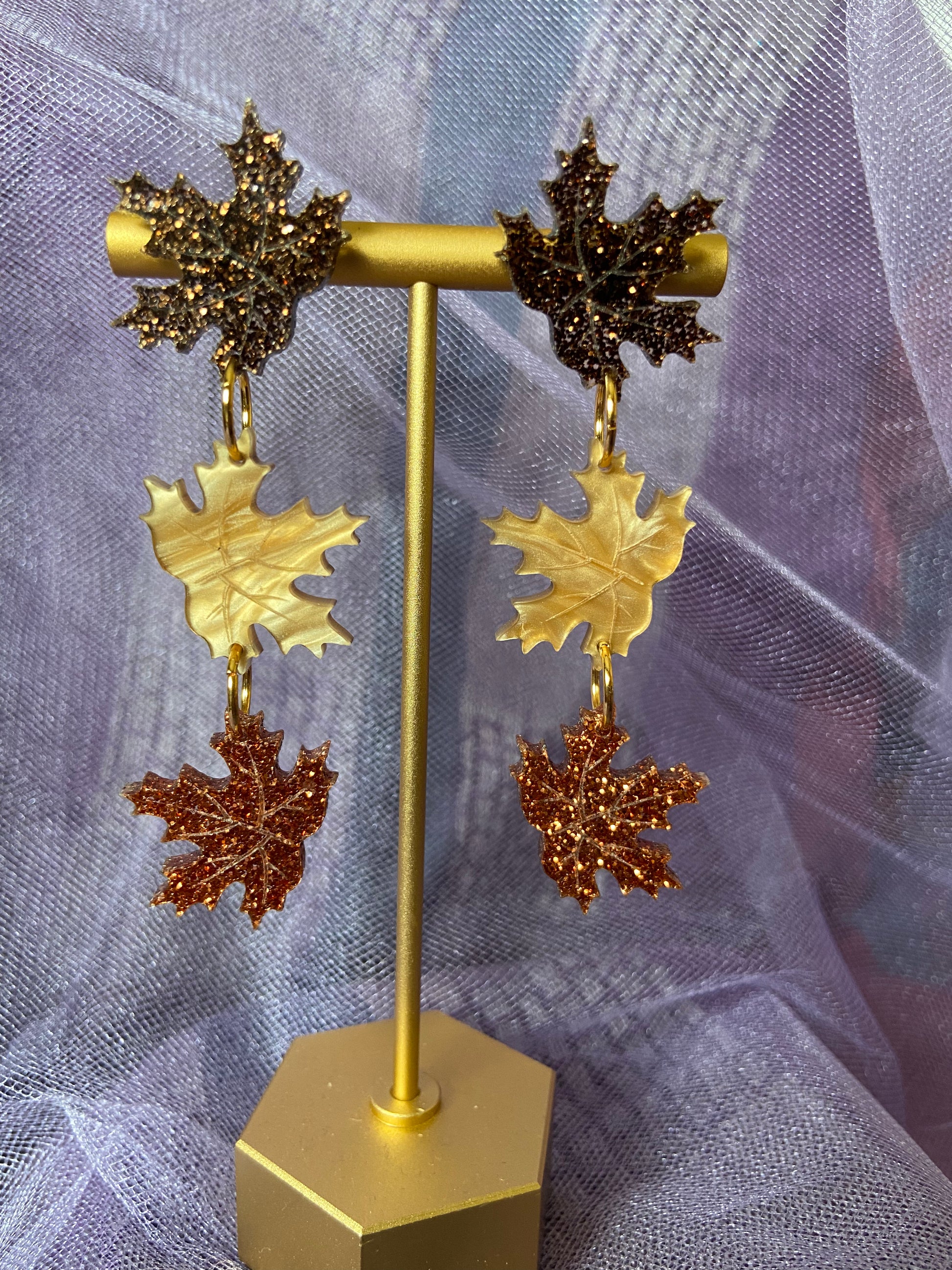 They are made of three shimmering acrylics: mocha glitter, honey pearl, and pumpkin spice glitter. The closure is stainless steel stud on the top leaf.