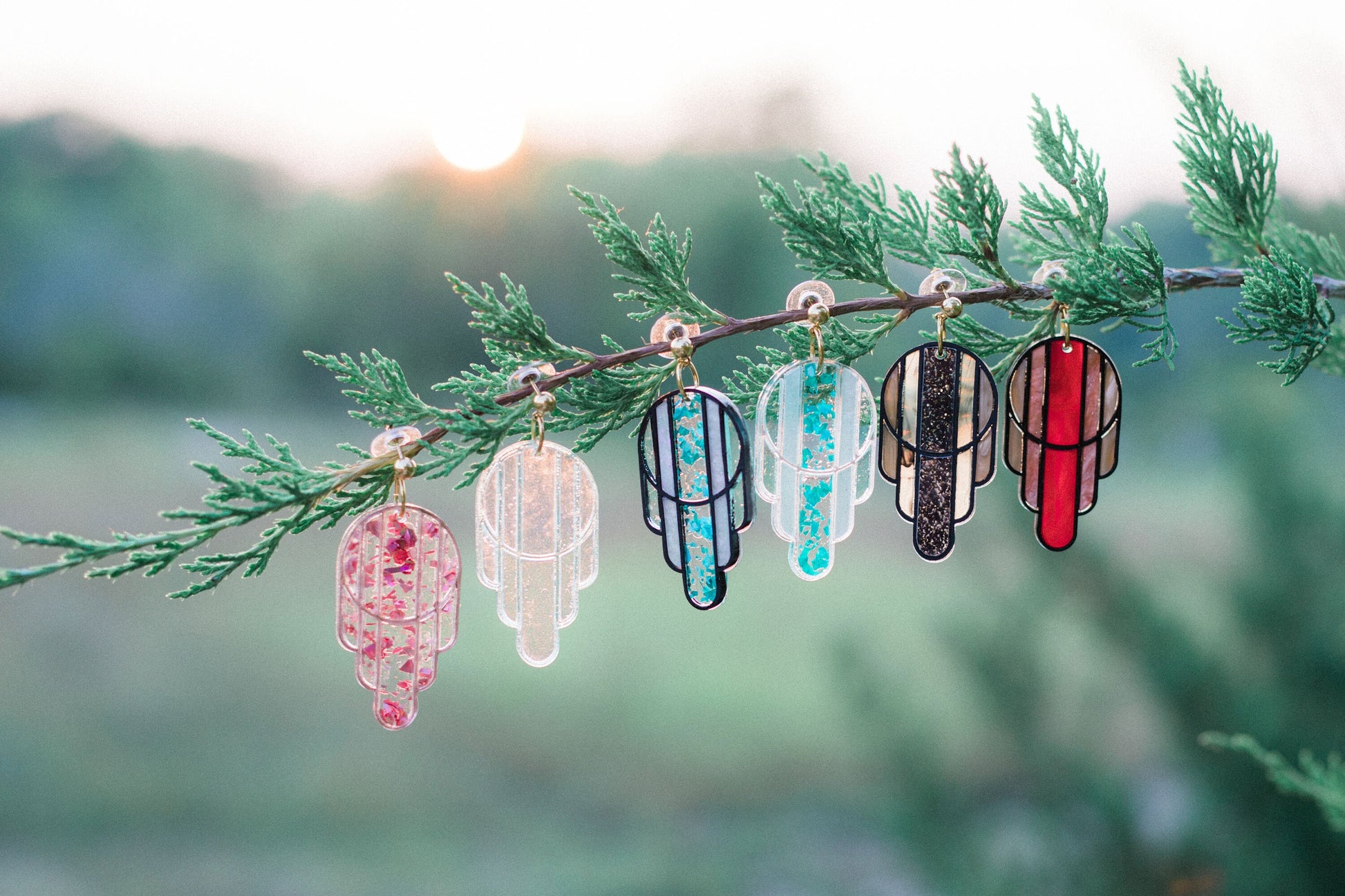 These acrylic earrings are made to look like Art Deco stained glass. I have many color variations available, and in pendants as well, check out the shop for all my variations. These elegant earrings are in Fall Leaves colors. The "panes" are in red pearl, orange glitter pearl, and amber pearl. The "frame" is in matte black. Studs pictured are gold finished stainless steel.