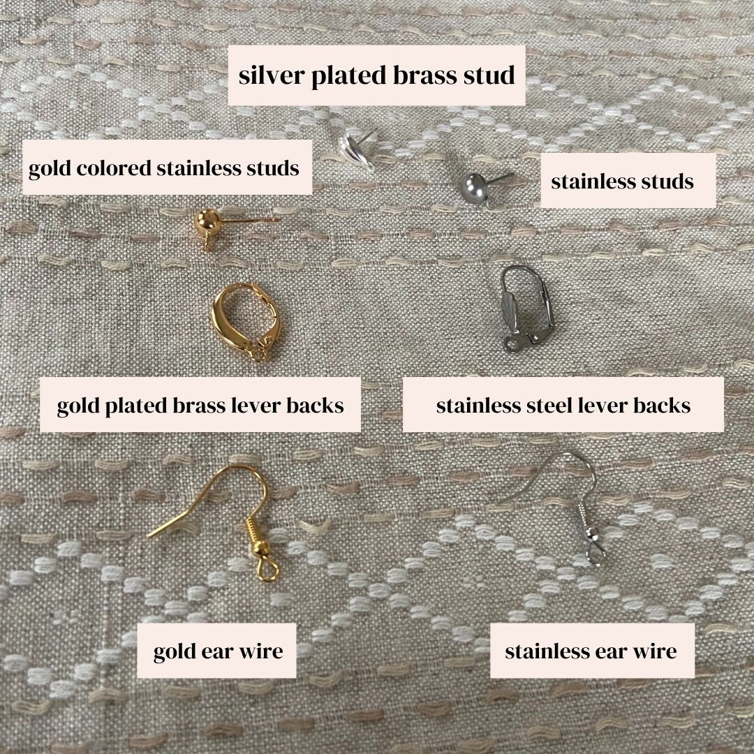 Since people prefer different closures, you have the option of selecting between studs, lever backs, and ear wires for your earring closure. The last picture shows an example of your choices. All earrings are hand assembled and designed by me.