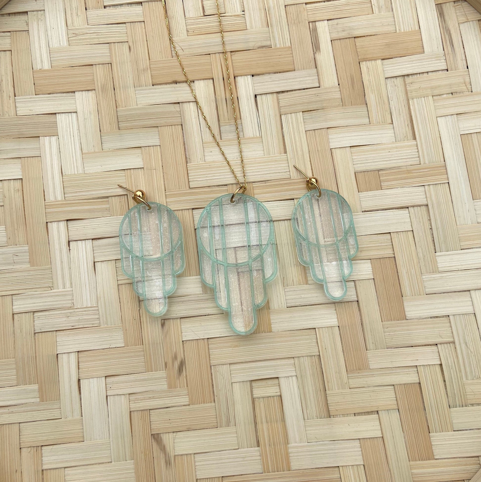 These acrylic earrings are made to look like Art Deco stained glass. I have many color variations available, and in pendants as well, check out the shop for all my variations. These elegant earrings are in Stardust and Sea Glass. The Stardust "panes" are clear and translucent with flecks of subtle glitter throughout giving them an ethereal feel. The "frame" is in Sea Glass, a clear acrylic with a hint of green to it.