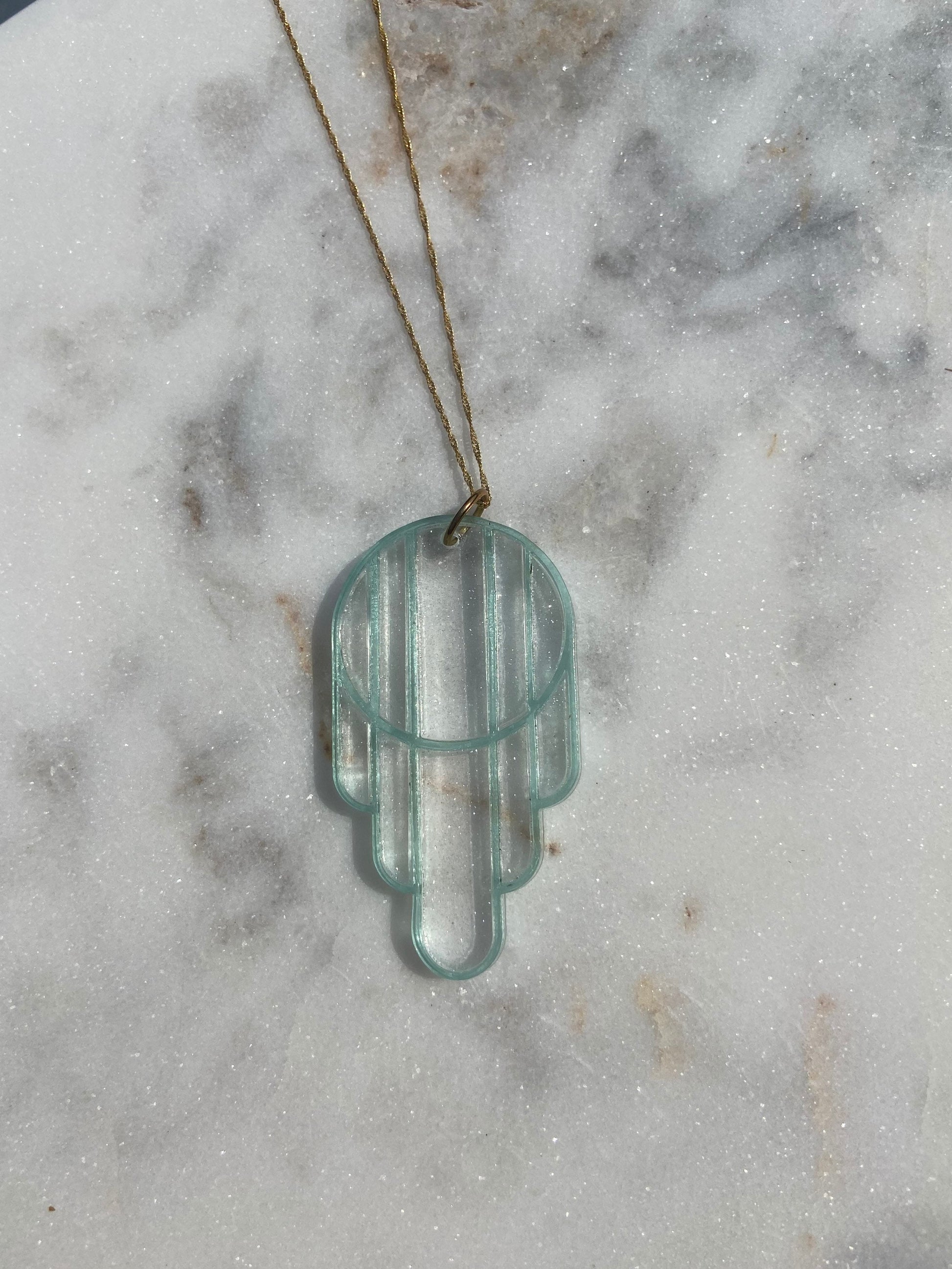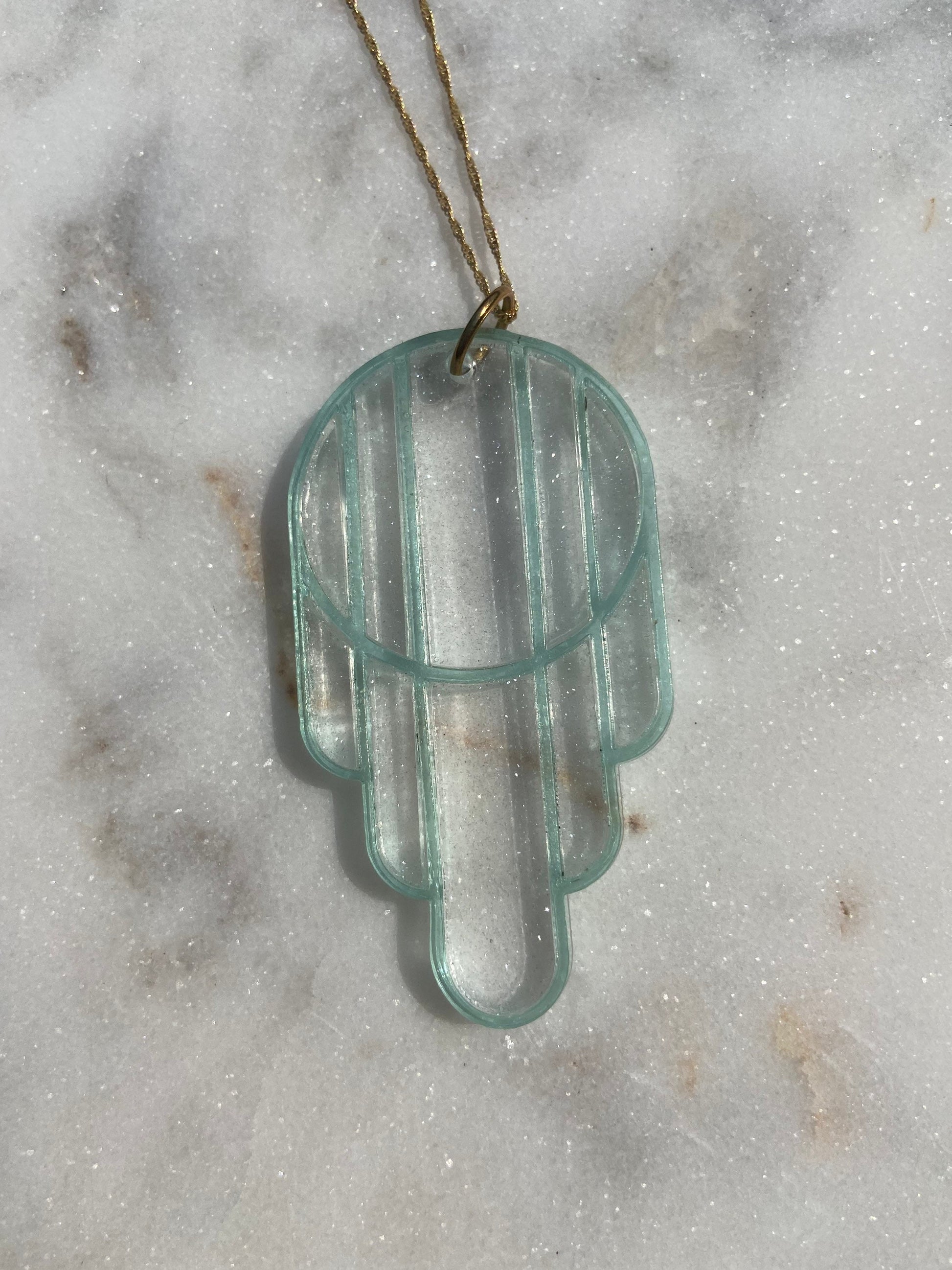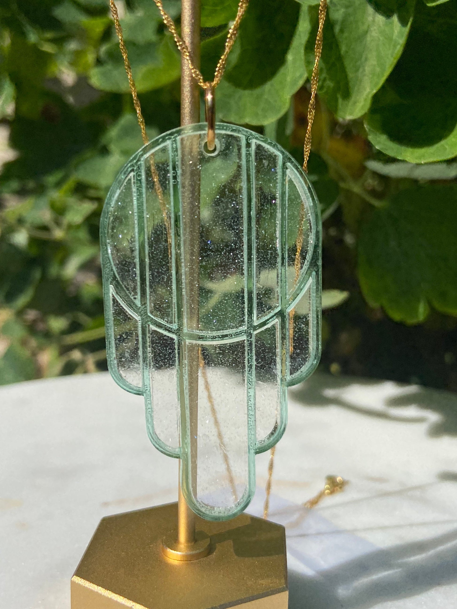 This acrylic necklace is made to look like Art Deco stained glass. I have many color variations available, and in earrings as well, check out the shop for all my variations. This pendant is in Stardust and Sea Glass. The Stardust "panes" are clear and translucent with flecks of subtle glitter throughout giving them an ethereal feel. The "frame" is in Sea Glass, a clear acrylic with a hint of green to it. The chain is 18" and gold plated. All pendants are hand assembled and designed by me.