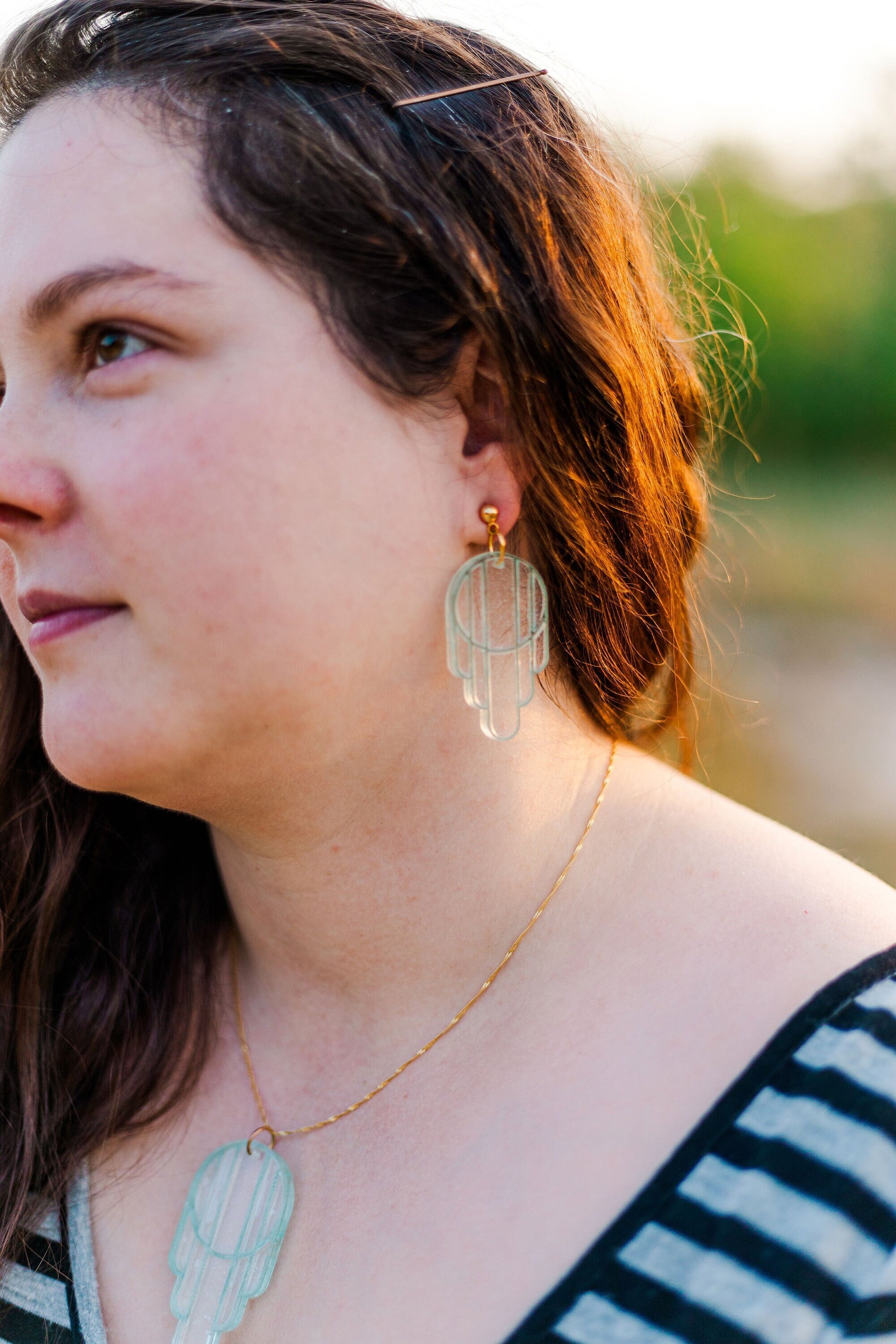 This acrylic necklace is made to look like Art Deco stained glass. I have many color variations available, and in earrings as well, check out the shop for all my variations. This pendant is in Teal Flake and Stardust. The "panes" are in metallic teal flake, mint glitter pearl, and sea glass. The panes are translucent giving them an ethereal and stained glass feel. The "frame" is in Stardust, which is clear with fine glitter. The chain is 18" and gold plated. All pendants are hand assembled and designed by me.