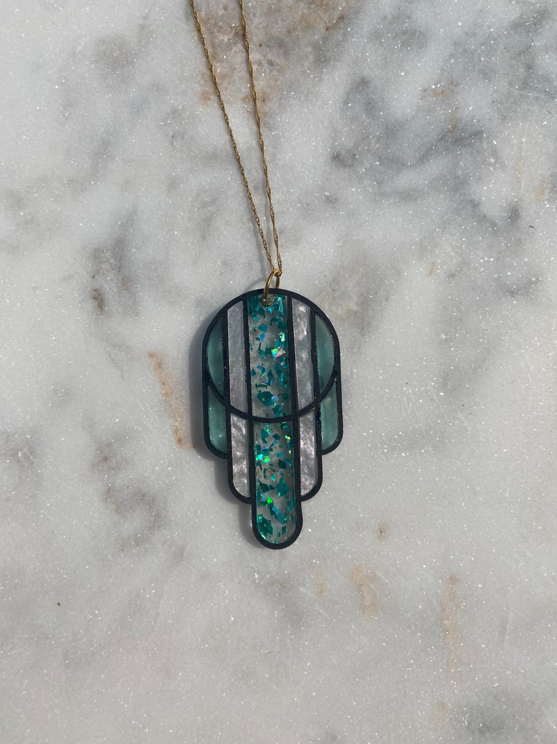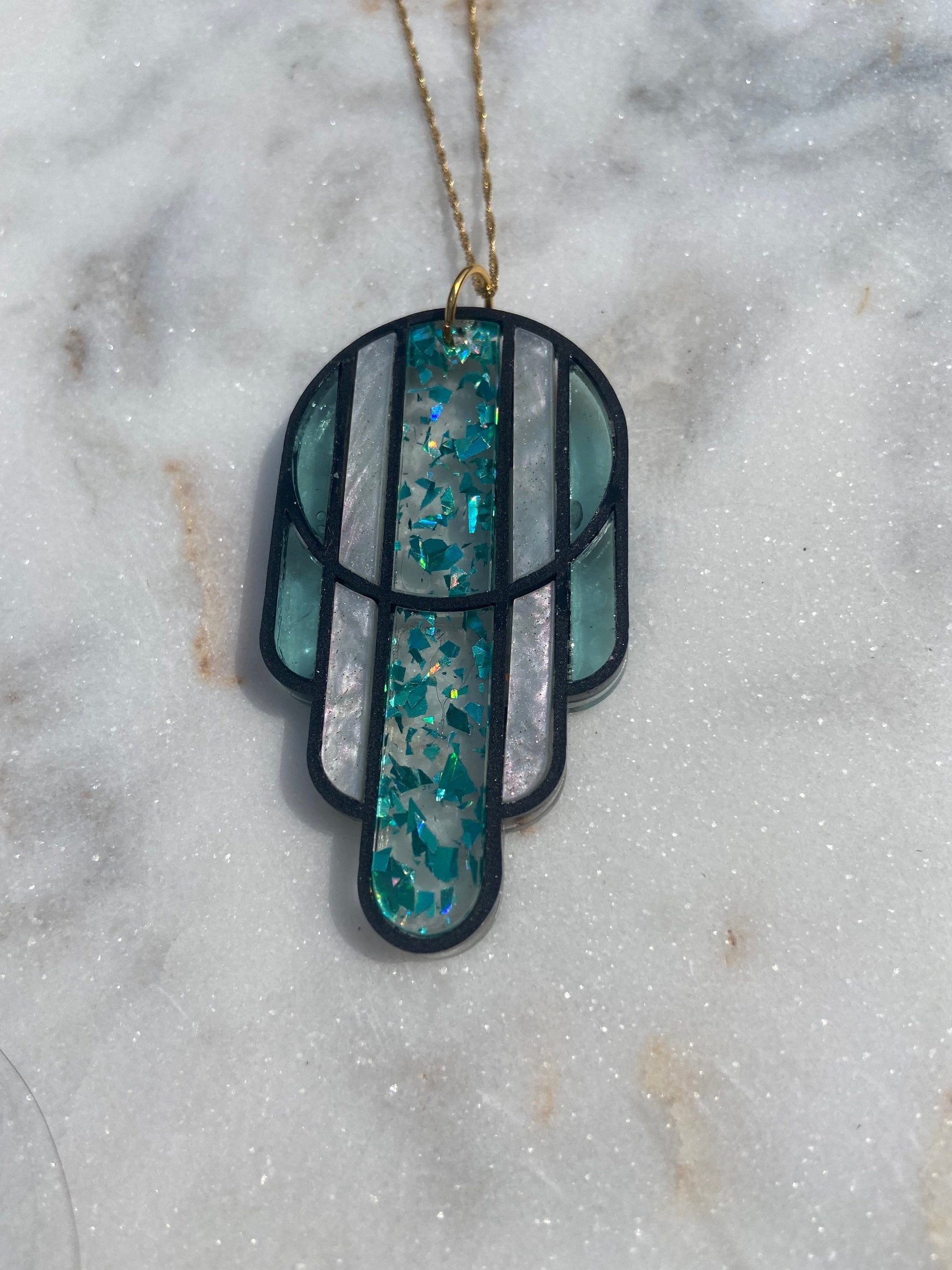This acrylic necklace is made to look like Art Deco stained glass. I have many color variations available, and in earrings as well, check out the shop for all my variations. This pendant is in Teal Flake and Matte Black. The "panes" are in metallic teal flake, mint glitter pearl, and sea glass. The panes are translucent giving them an ethereal and stained glass feel. The "frame" is in matte black. The chain is 18" and gold plated. All pendants are hand assembled and designed by me.