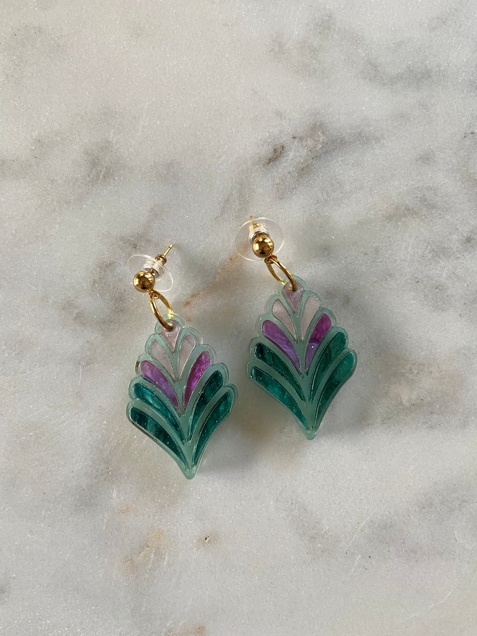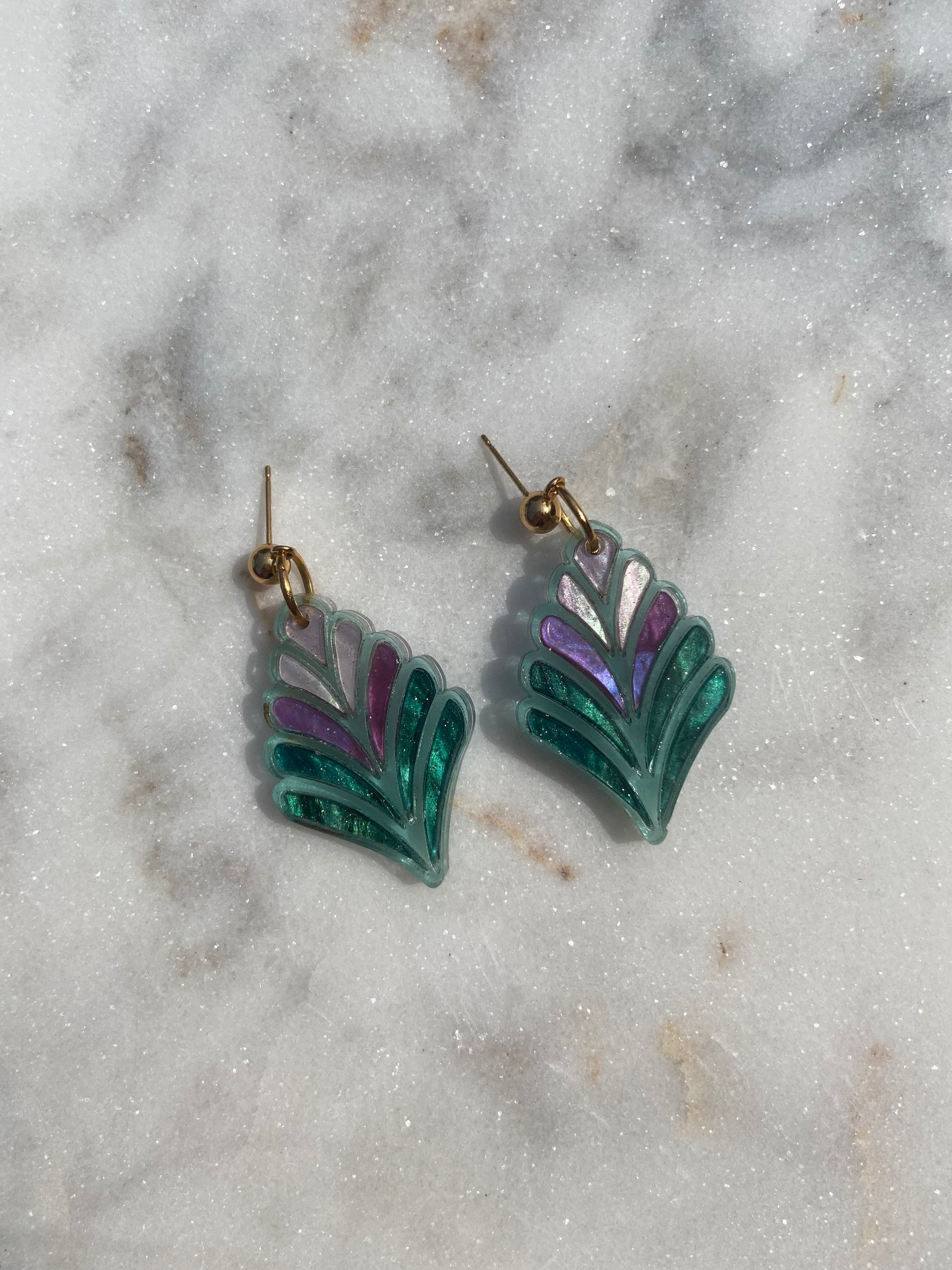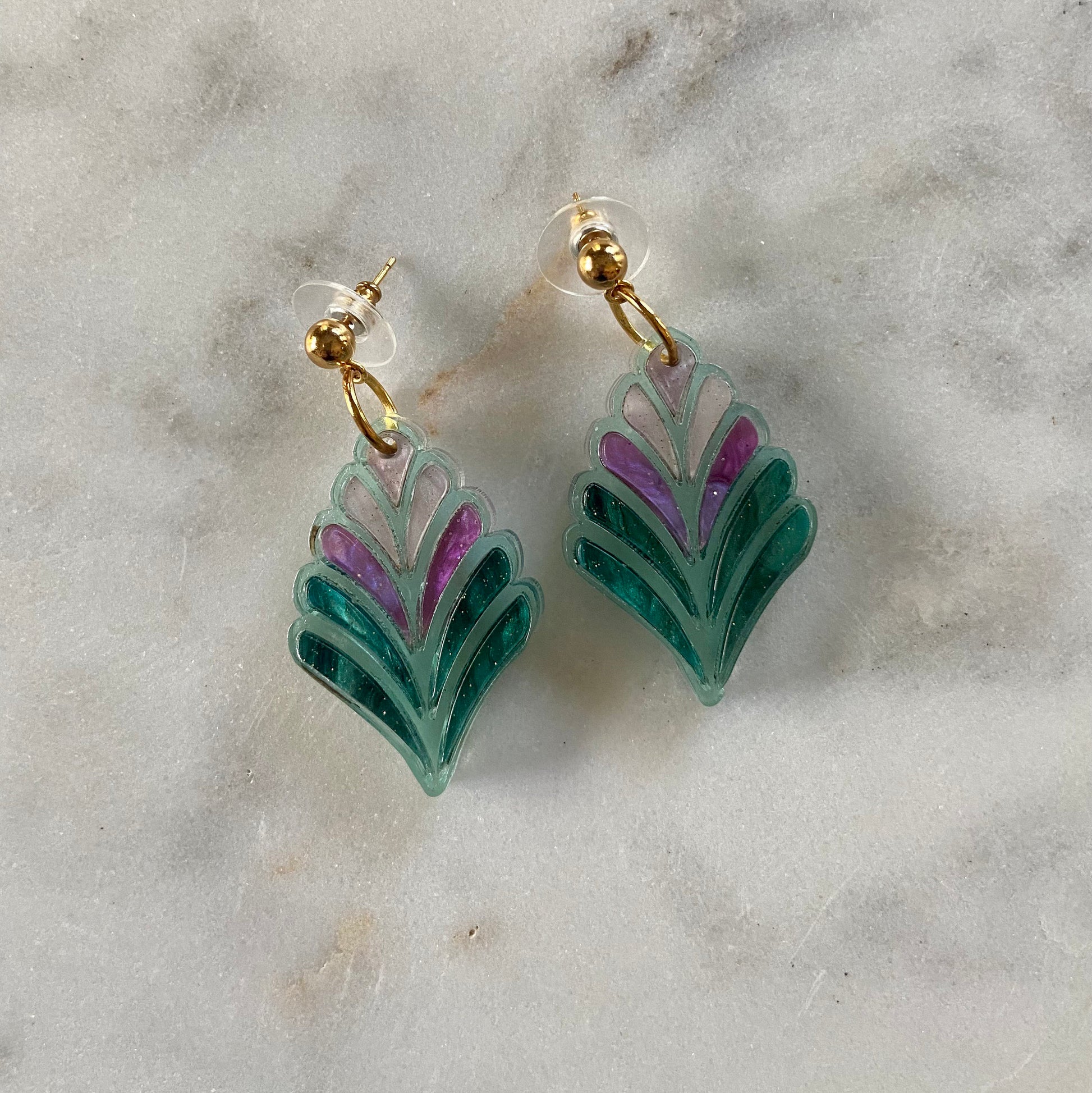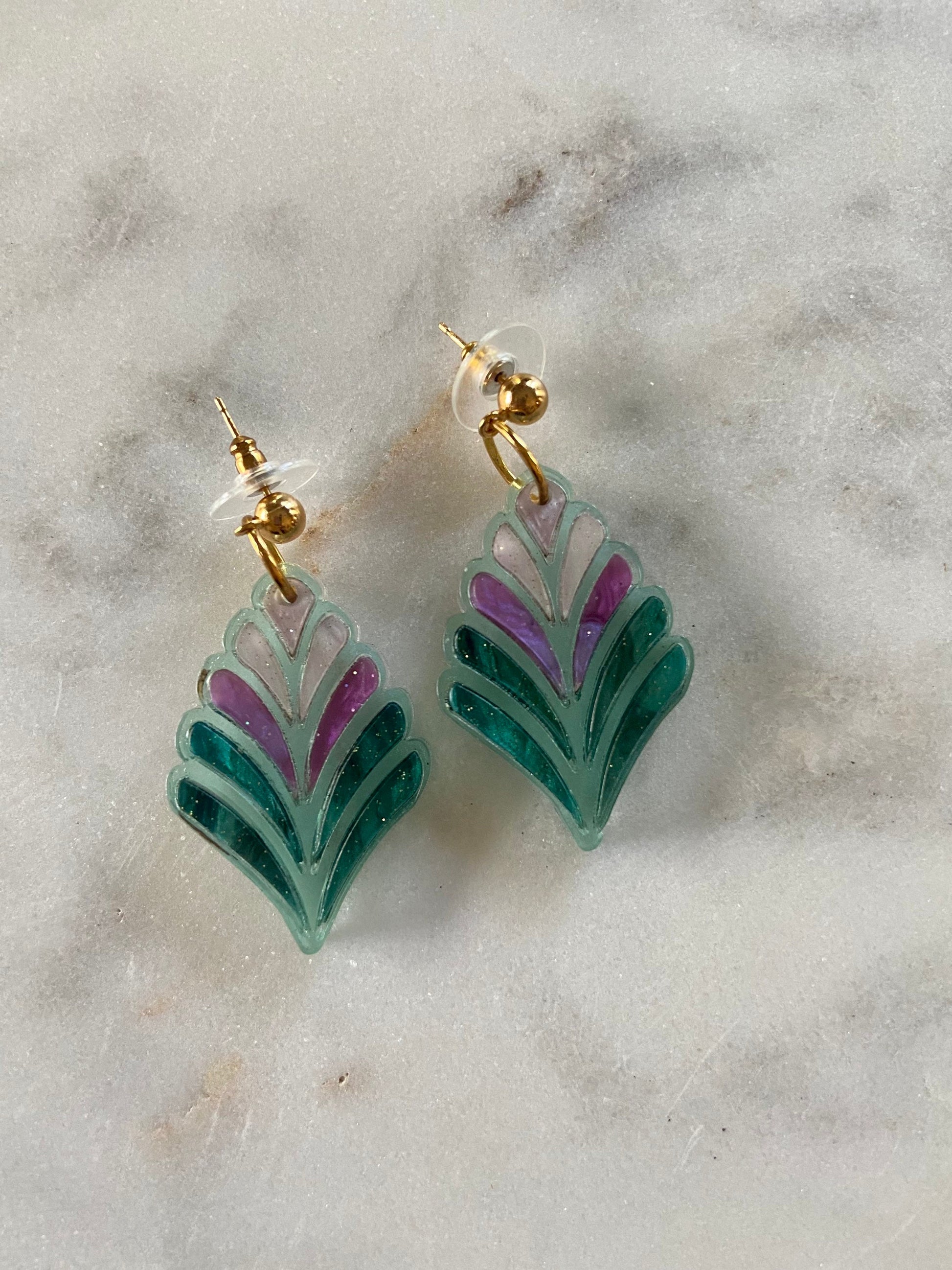 These acrylic earrings are made to look like Art Deco stained glass. I have many color variations available, and in pendants as well, check out the shop for all my variations. This variation I’m calling Magic Forest. The flower petals are made of dark teal, and shades of purple. They all have flecks of glitter and are pearlescent in light. The frame or "panes" are in translucent sea glass. These dangle earrings are bold in color with an ethereal feel.