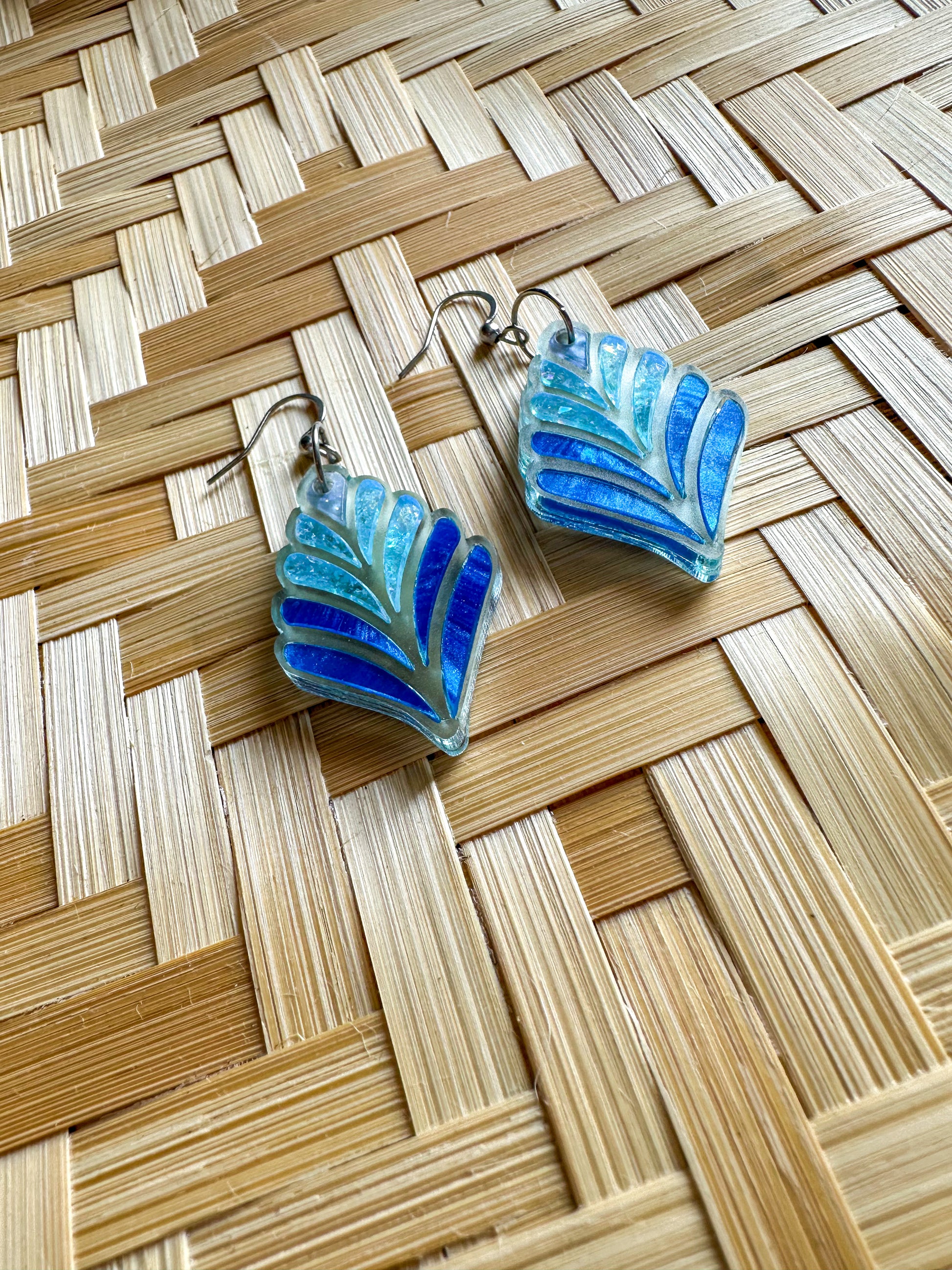 These acrylic earrings are made to look like Art Deco stained glass. The flower petals are in ocean shades of blue. Some of the blues are pearlescent and the others shimmer with flecks of glitter. The frame or "panes" are in translucent sea glass green. These dangle earrings are delicate in color with an ethereal feel.
