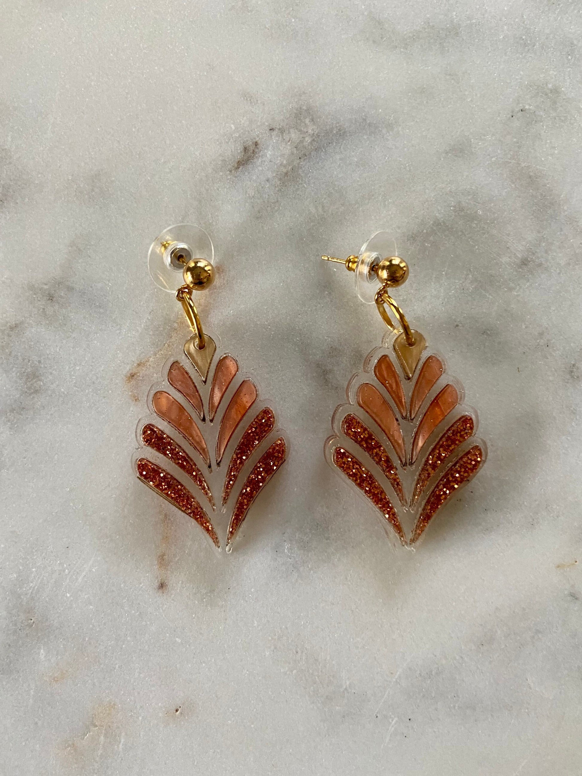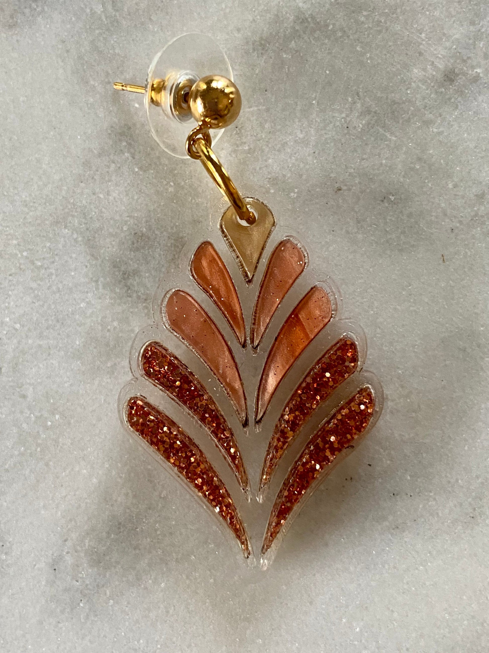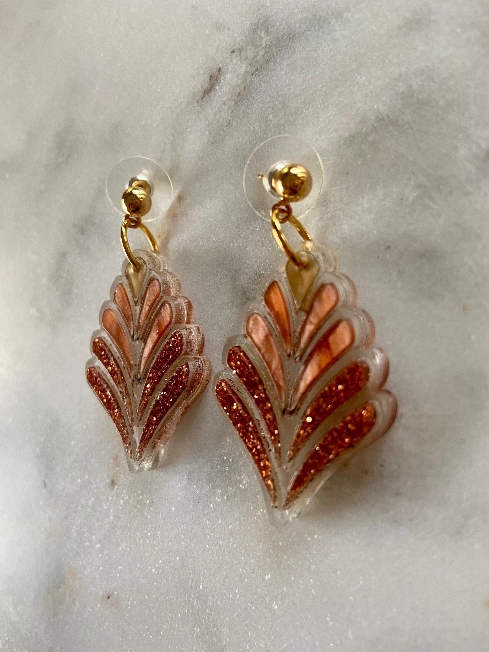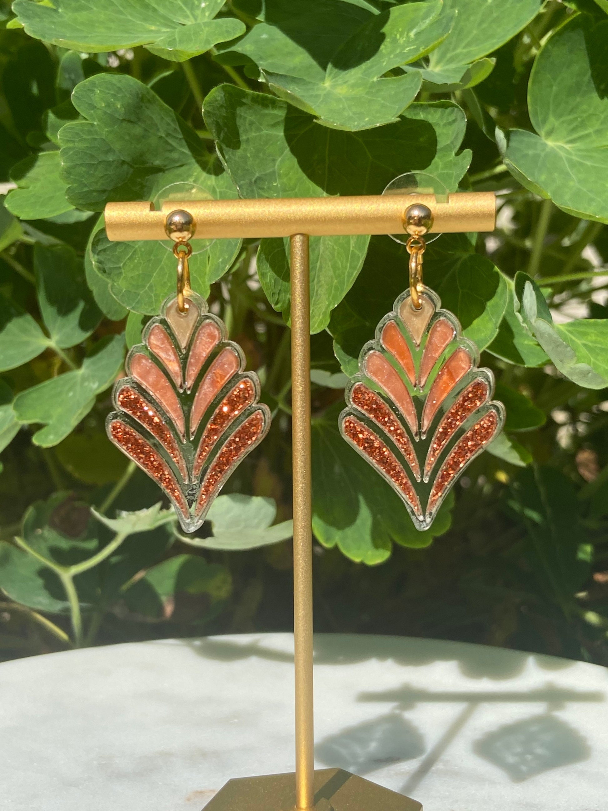 These acrylic earrings are made to look like Art Deco stained glass. I have many color variations available, and in pendants as well, check out the shop for all my variations. This variation I’m calling this version Pumpkin Spice. The flower petals are made of shades of orange glitter. The bottom petal are glitter while the others are pearlescent with subtle flecks of glitter. The frame or "panes" are in translucent clear. These dangle earrings are bold in color with an ethereal feel. Studs pictured are gold finished stainless steel and nickel free. I know some people prefer studs and some prefer ear wire, so you have the option of selecting your earring closure. The last picture shows an example of your choices. All earrings are hand assembled and designed by me.
