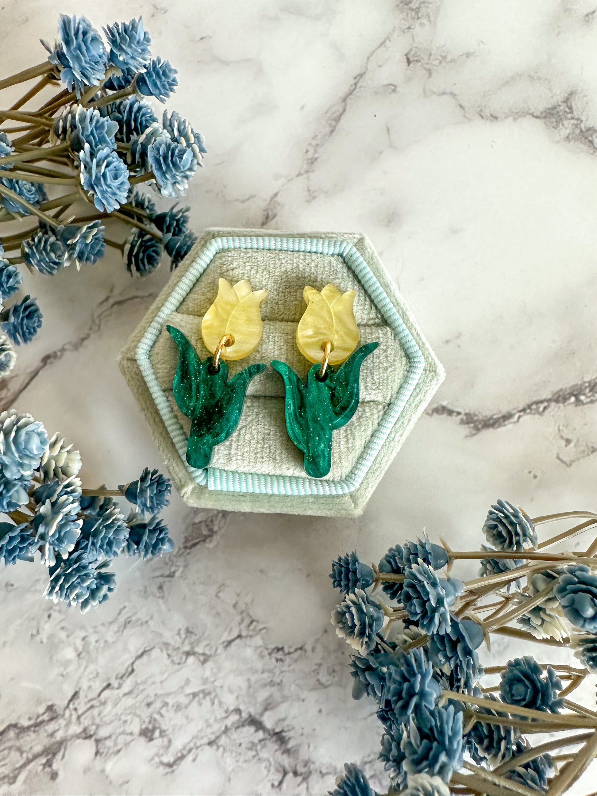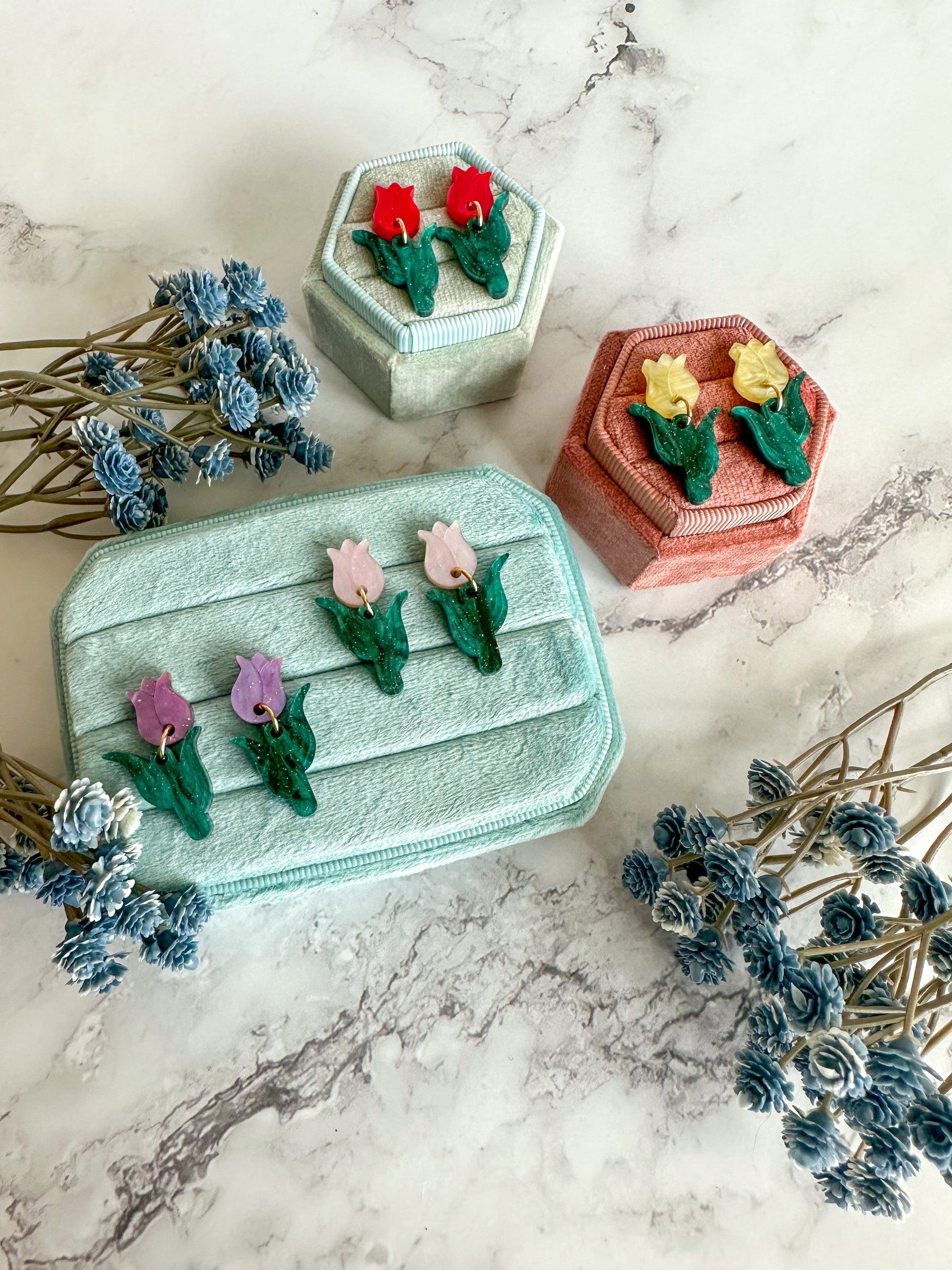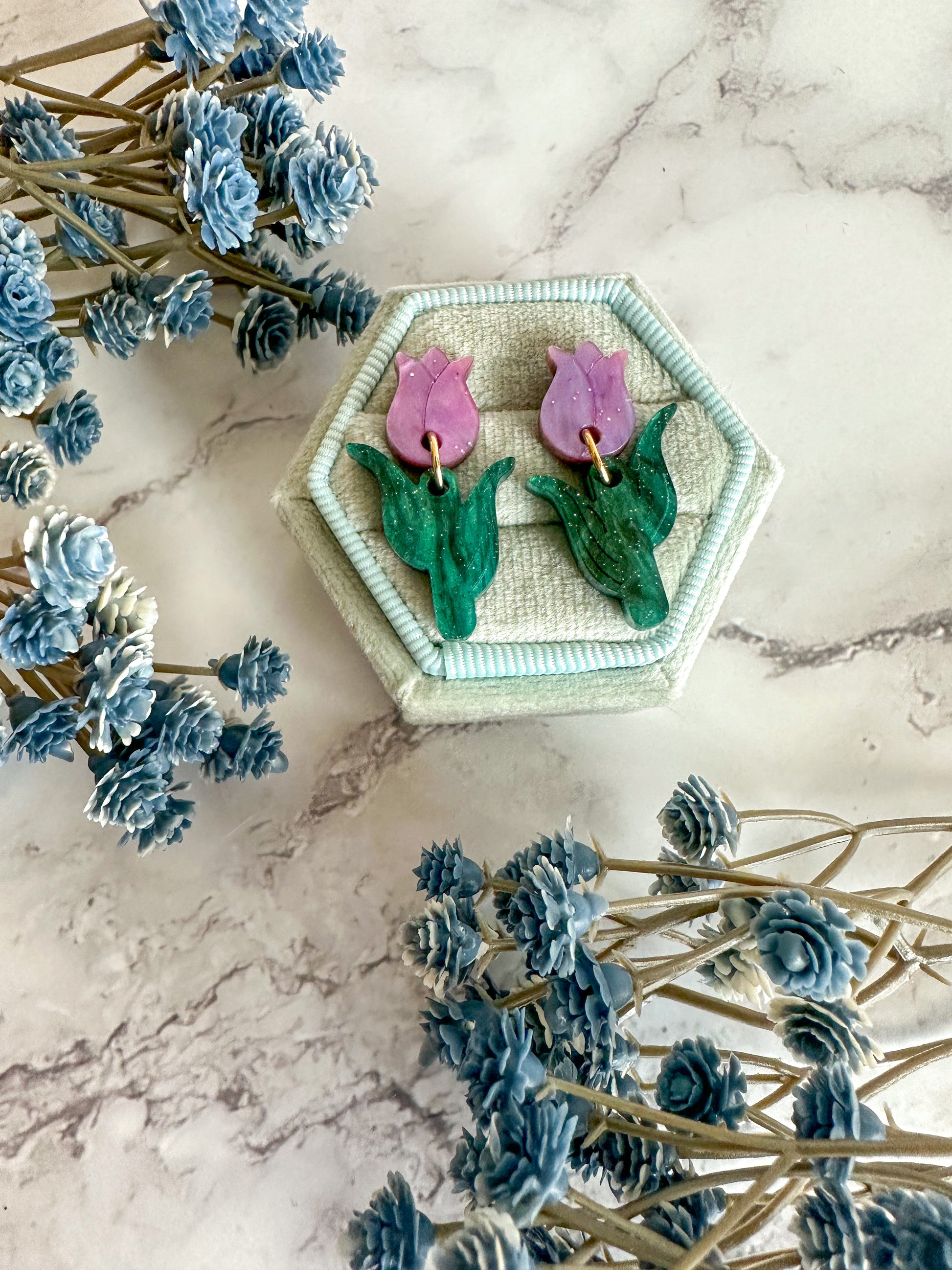 Tulip Mini Dangles No flower celebrates spring as a much tulips. This style is on the smaller side, resulting in a delicate yet bold in look earring. The tulip blossom is the stud and the petals dangle delicately below. These dangle earrings come in a variety of colors, just like actual tulips. The studs are made with nickel free stainless steel.