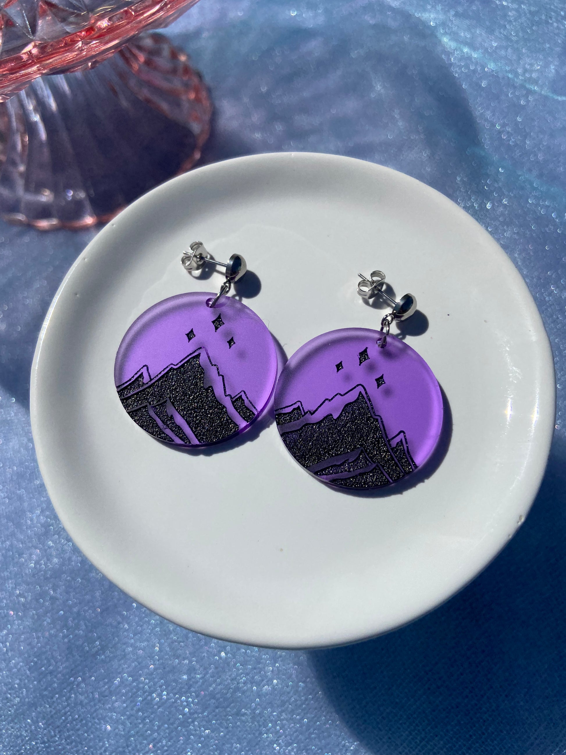 This design is inspired by ACOTAR and the Night Court insignia. The Mountain of Ramiel is engraved and hand painted black. There are two colorway choices for this design - midnight sky or frosted purple. Every pair of the midnight sky is unique due to the abstract swirl of the acrylic. This design is versatile in being bookish for fans of ACOTAR, yet subtle enough for the everyday.