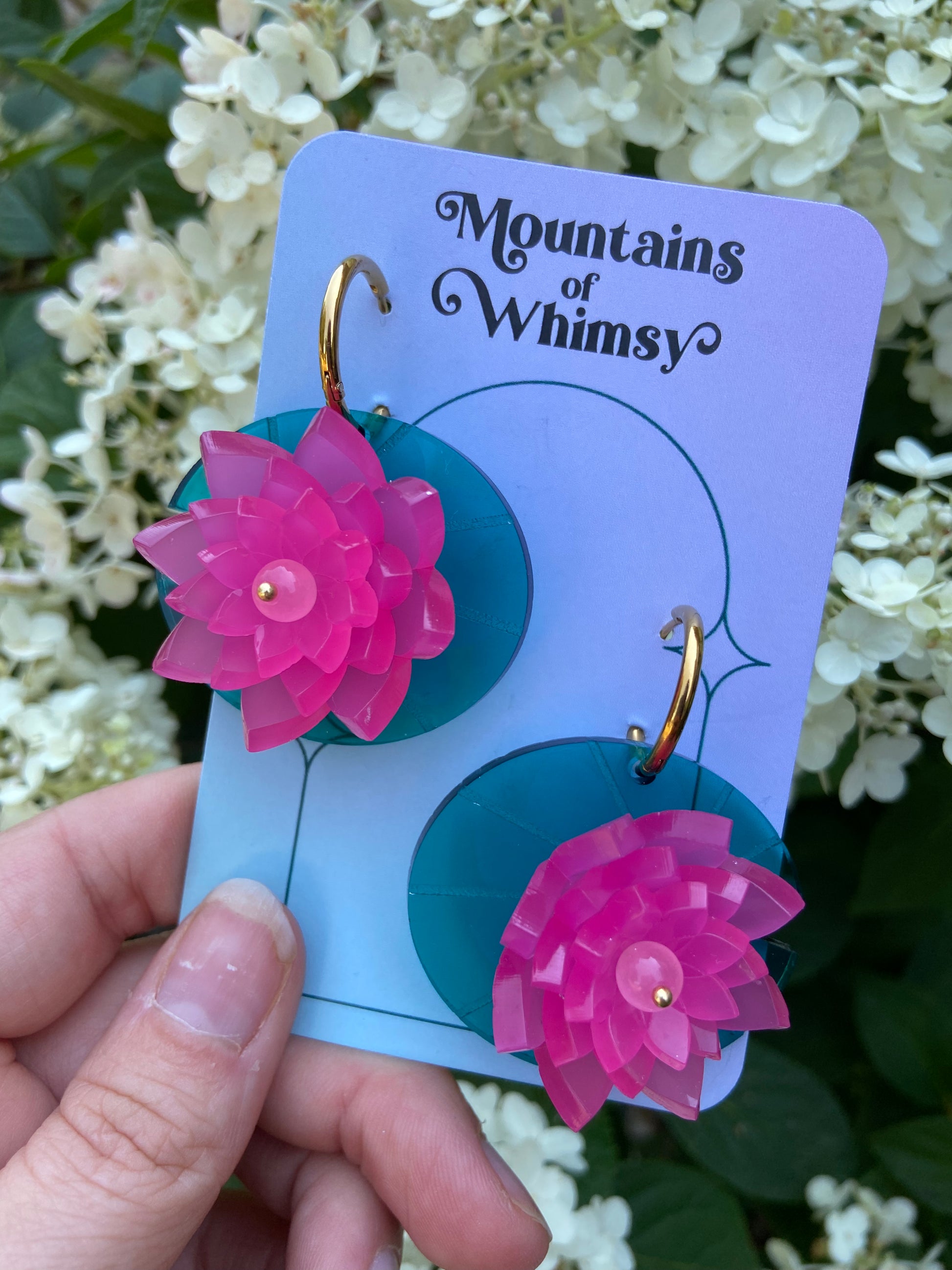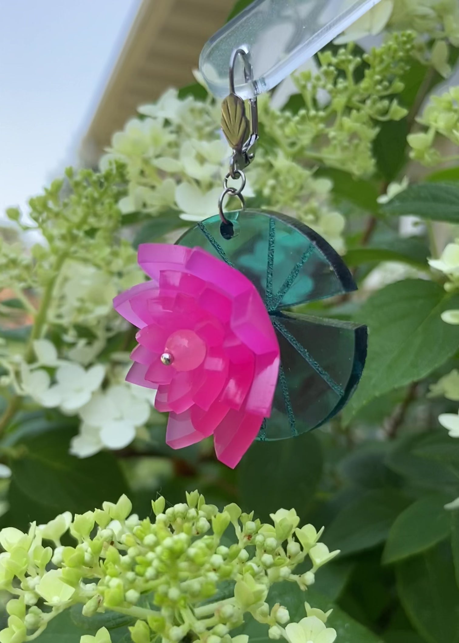 Inspired by the tranquil flowers found in summer ponds, these earrings make a statement. This style differs from others in our shop by being three dimensional. The water lilies are made of heat formed acrylic and glass beads, sitting on a emerald teal lily pad.