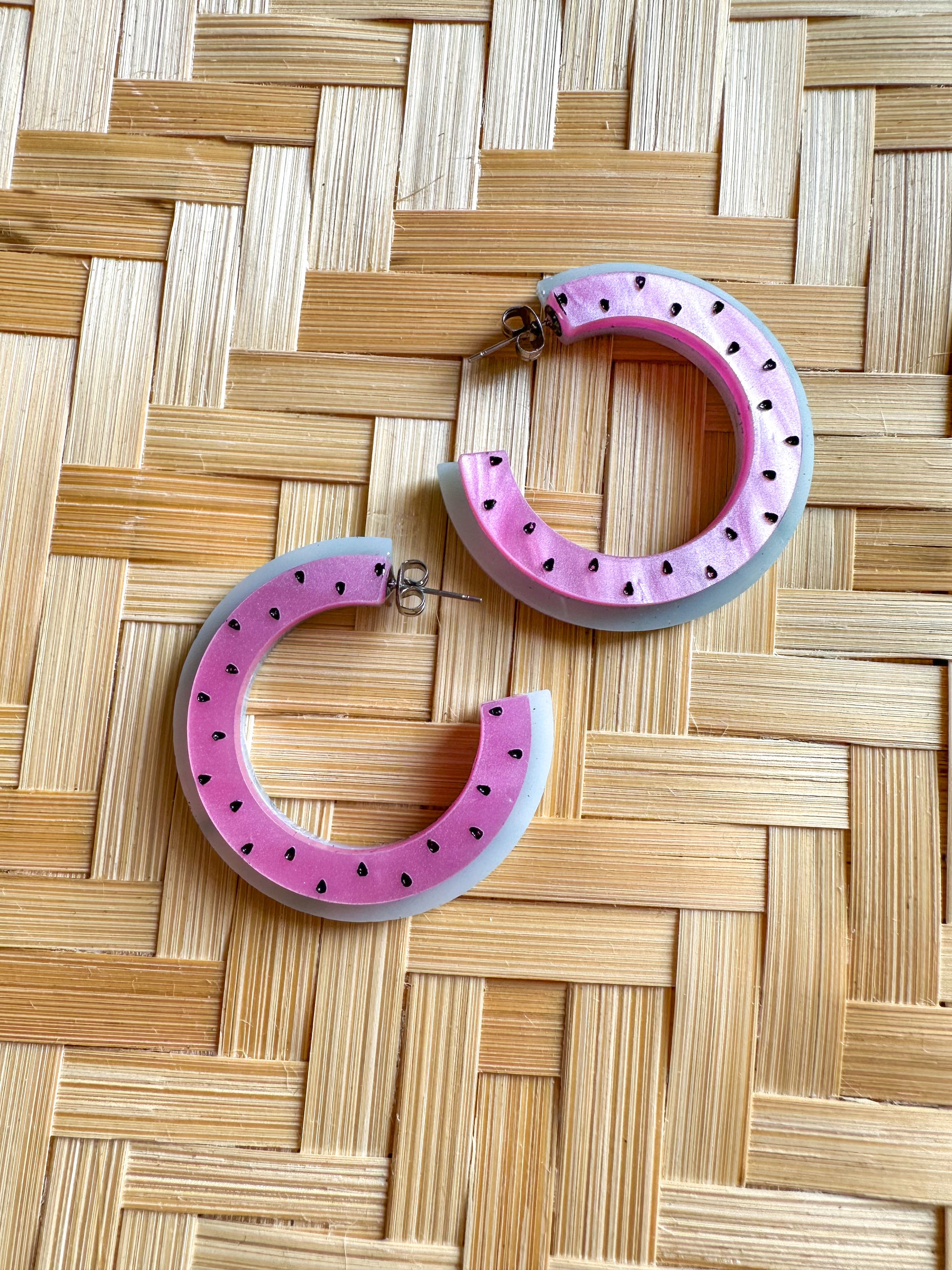 These hoops earrings are the essence of summery fun. Each hoop looks like a slice of bright, pink watermelon. The pink is pearlescent and the green rinds have of depth of color.