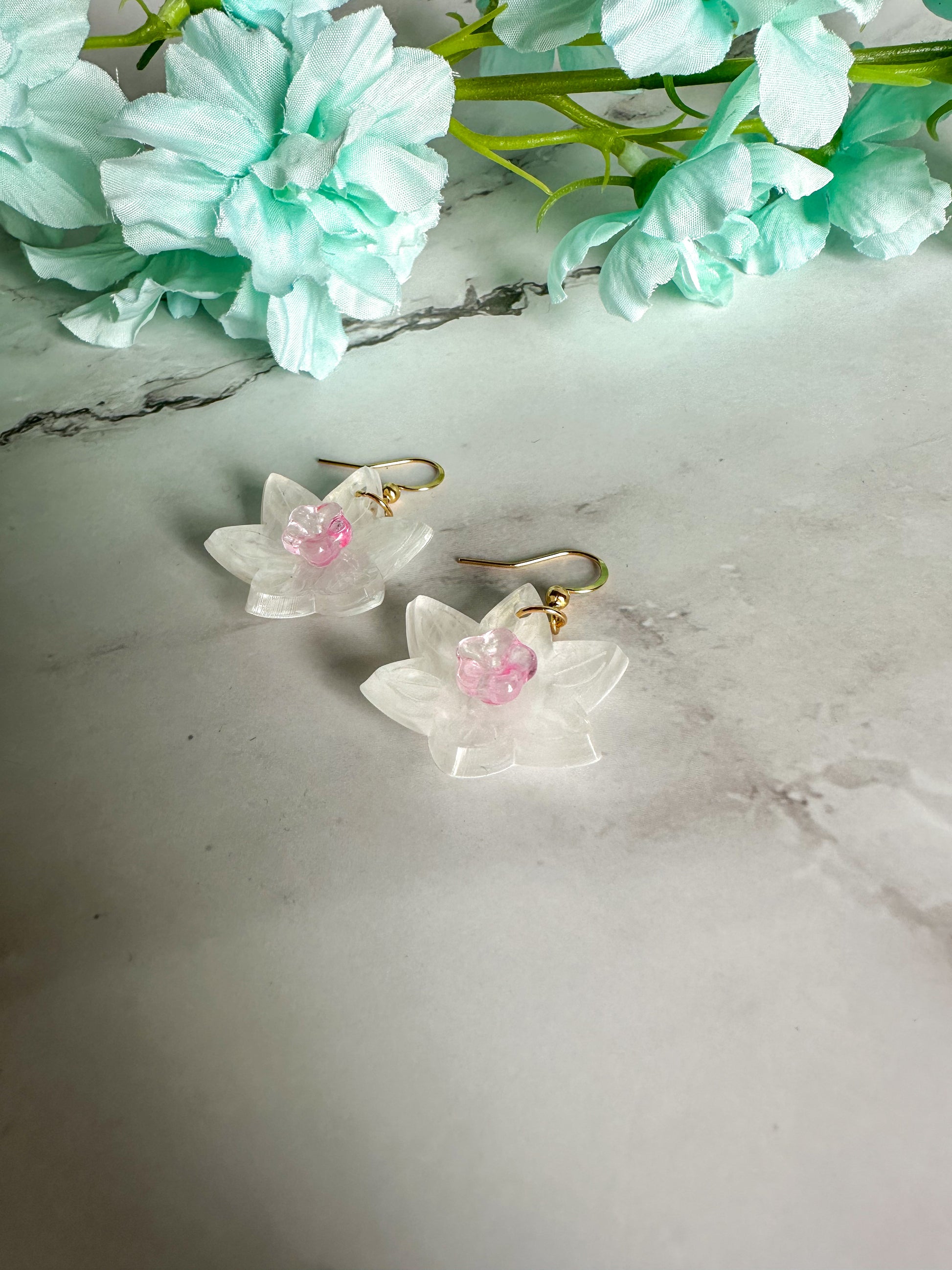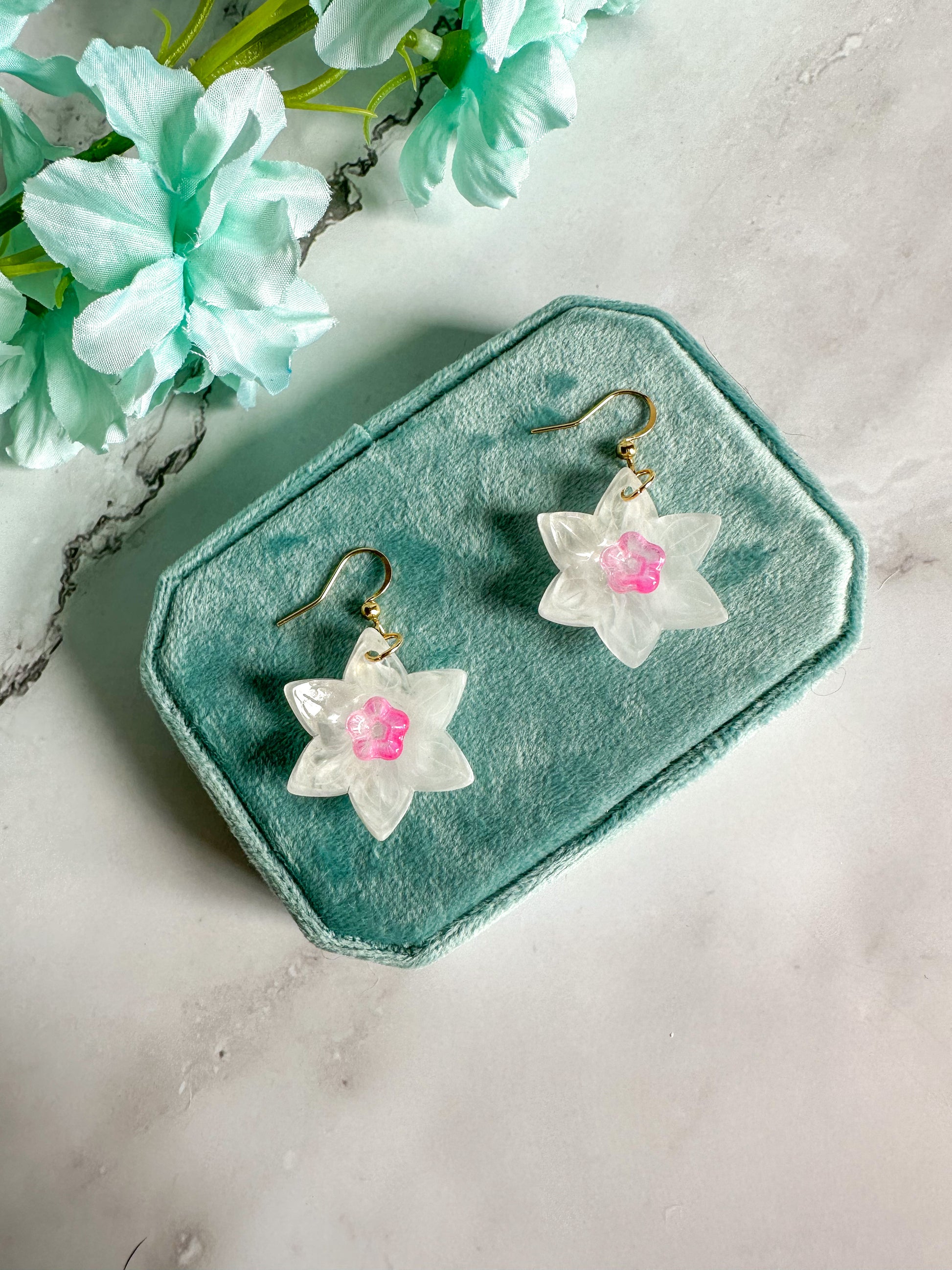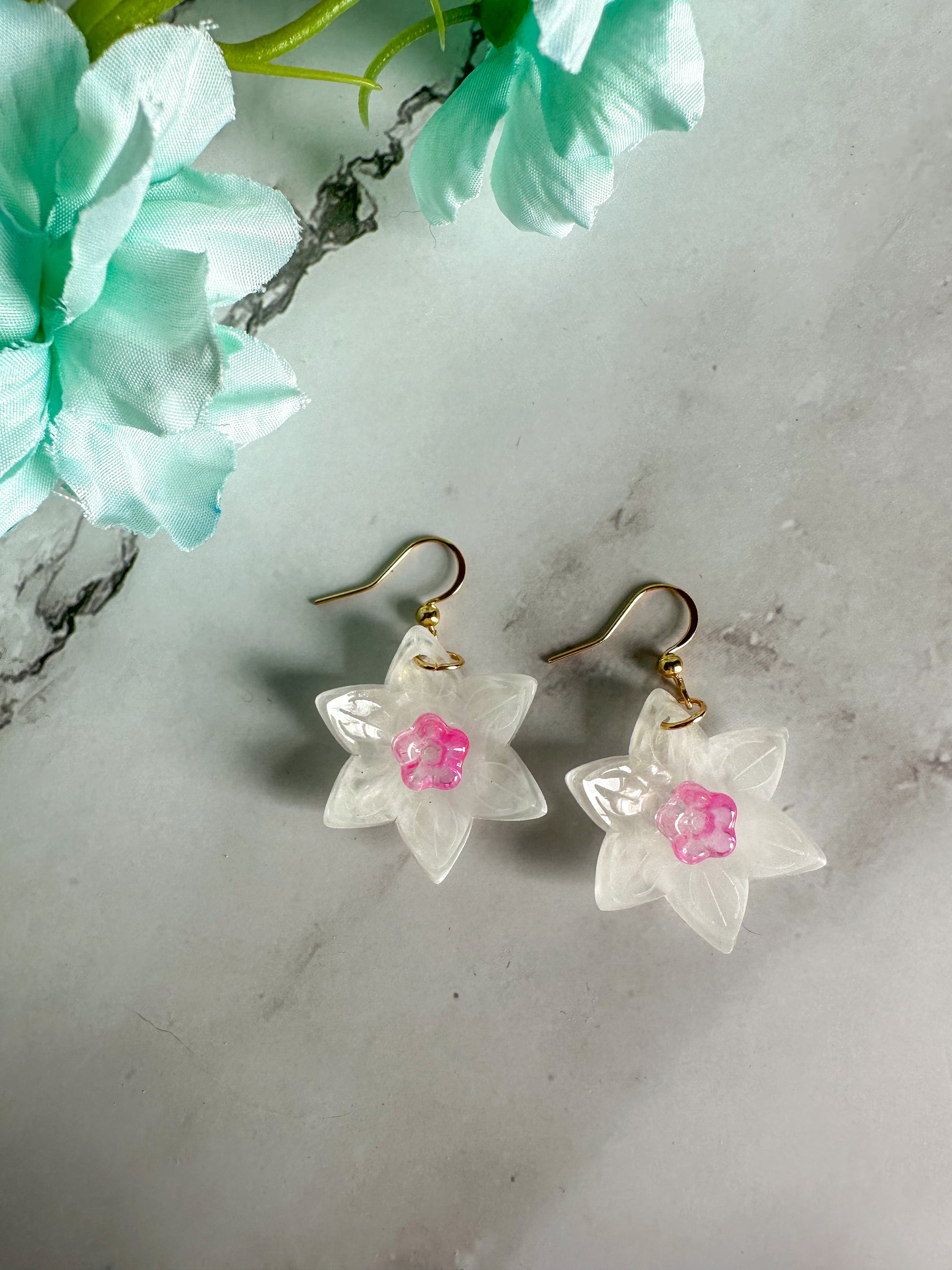 Perfect spring earrings that can also be worn all summer. The white of the flowers has a delicate swirl adding dimension and translucence; no two pairs are exactly the same. The trumpet of the daffodils comes in pink and blue colorways.