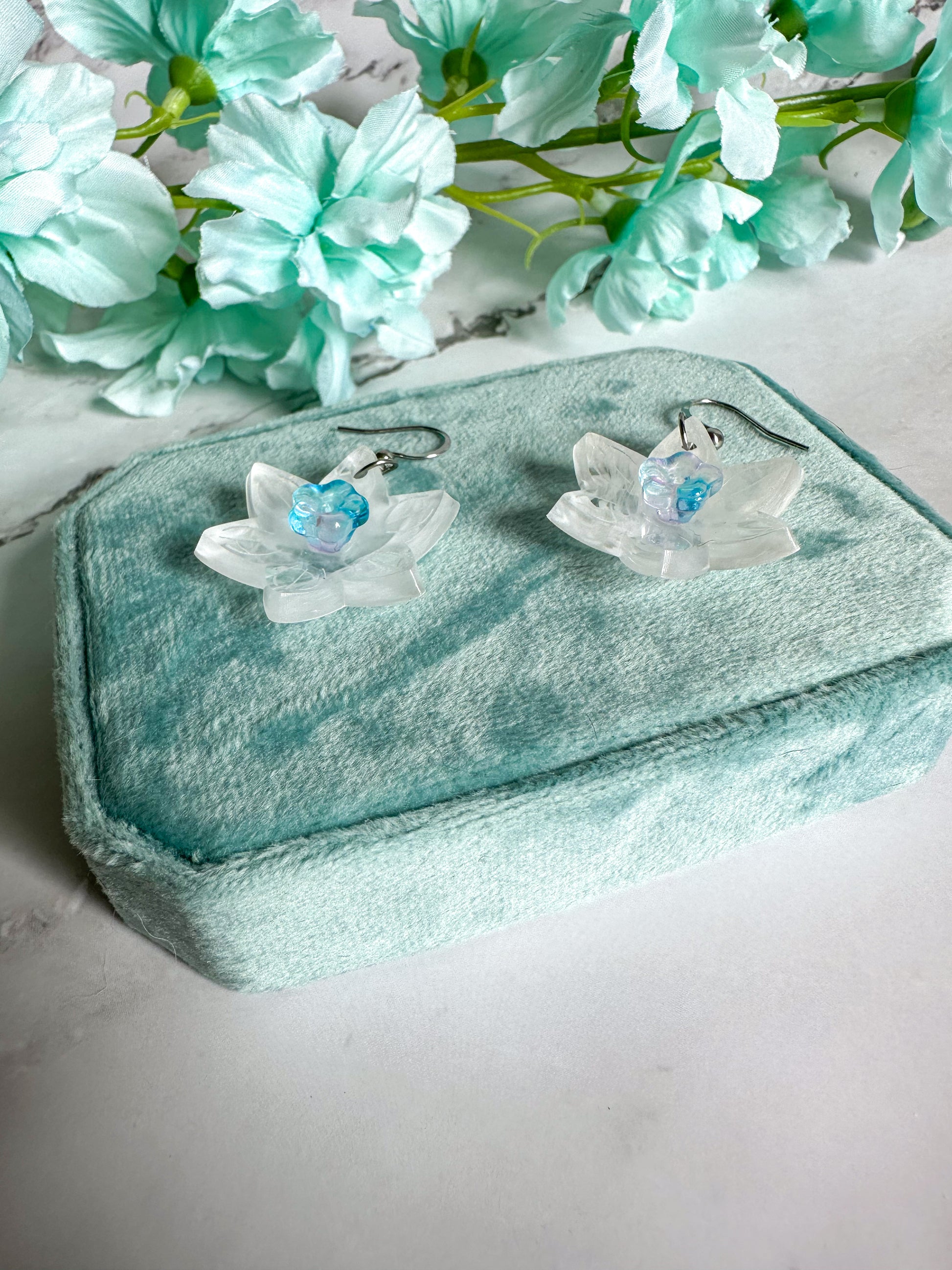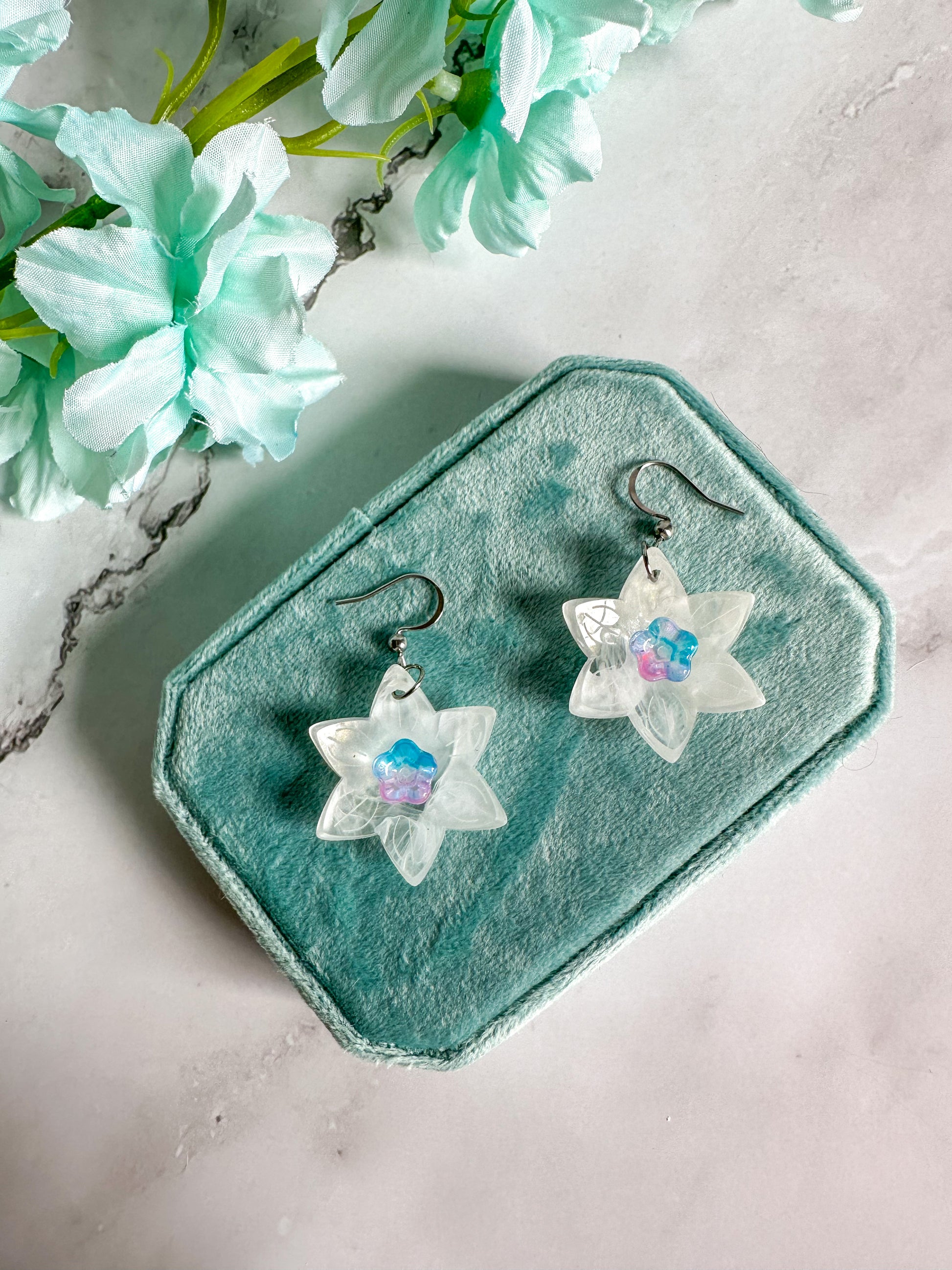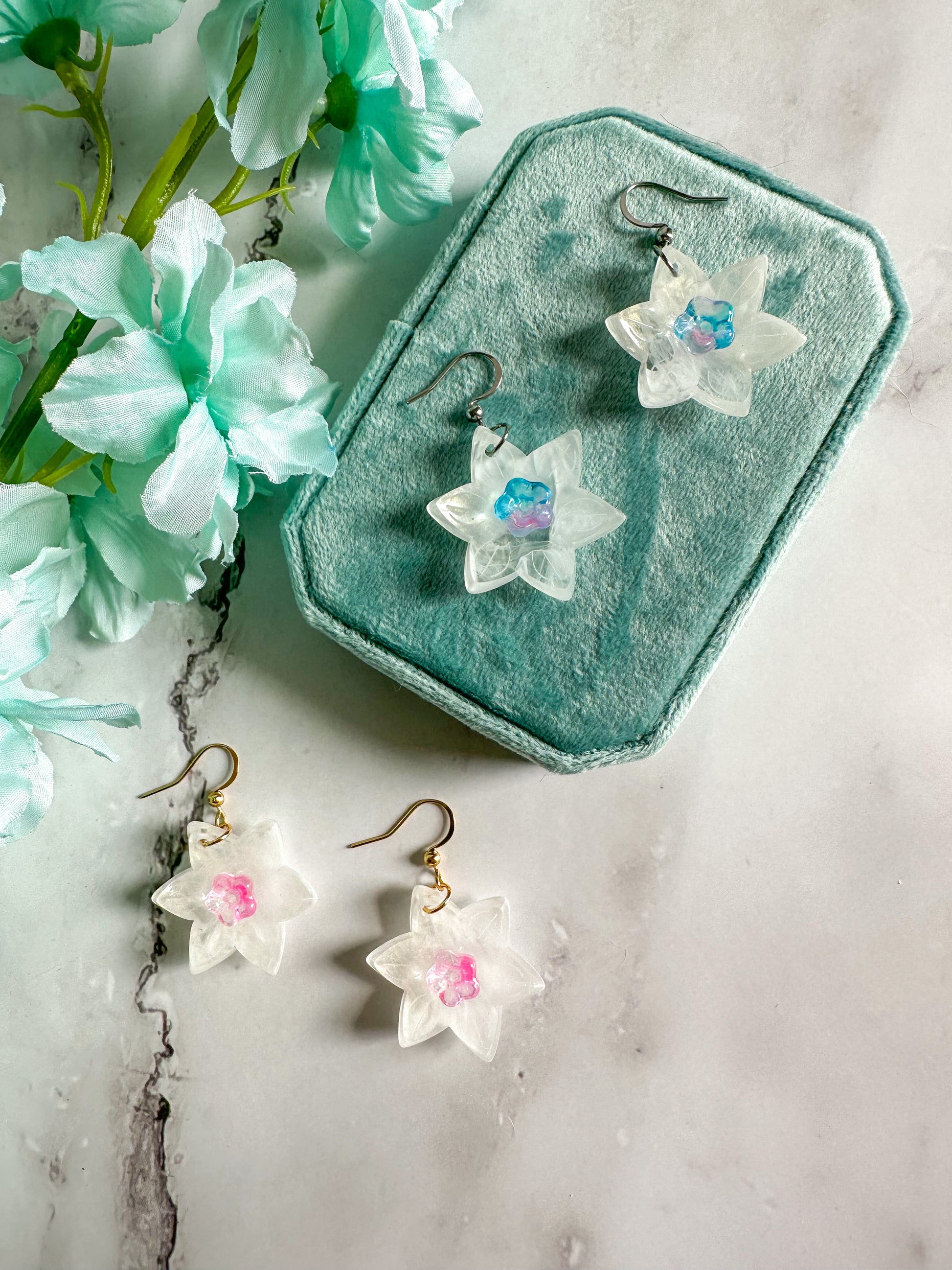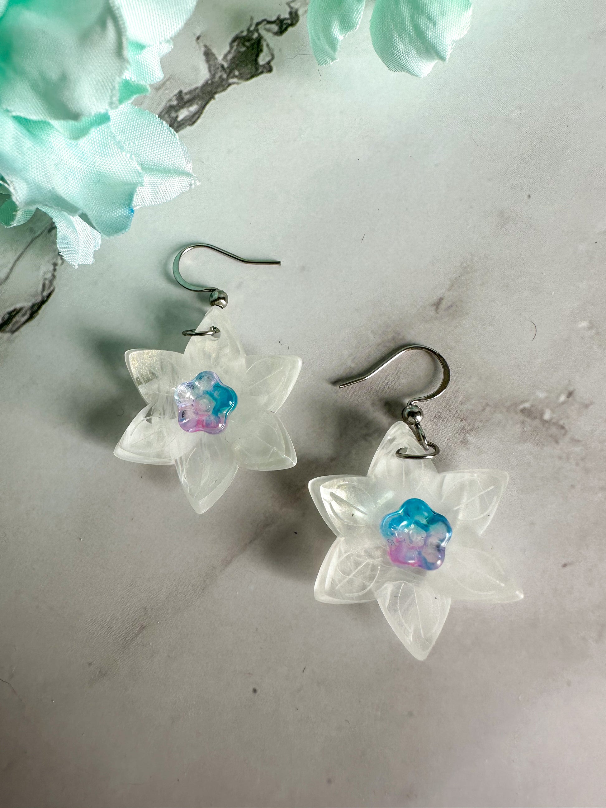 Perfect spring earrings that can also be worn all summer. The white of the flowers has a delicate swirl adding dimension and translucence; no two pairs are exactly the same. The trumpet of the daffodils comes in pink and blue colorways.